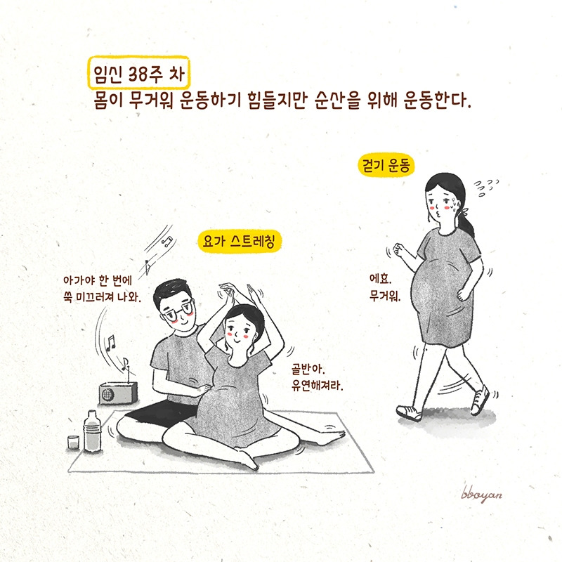 37주에서 40주는 아이가 언제든 나와도 되는 시기이고 진진통이 올 수 있으므로 병원 갈 준비물을 미리 챙겨 놓아야 한다. 임신 39주 차가 되니 질 분비물이 많아지고 배 뭉침이 자주 찾아와 저녁에 잠을 설치고 방귀가 시도 때도 없이 나왔다. 의사 선생님은 아기가 작다고 운동을 하지 말라고 했지만 하루에 1시간씩 걷기 운동하고 짐볼 위에서 골반을 유연하게 해주는 스트레칭을 계속했다. 출산 예정일이 지나도 나올 생각을 안 하는 아기. 임신 40주 0일까지 아무 소식도 없다가 2일 뒤 출산 임박 신호가 왔다. 팬티에 빨간 이슬이 비쳤고 짧고 규칙적인 간격으로 진진통이 왔다.