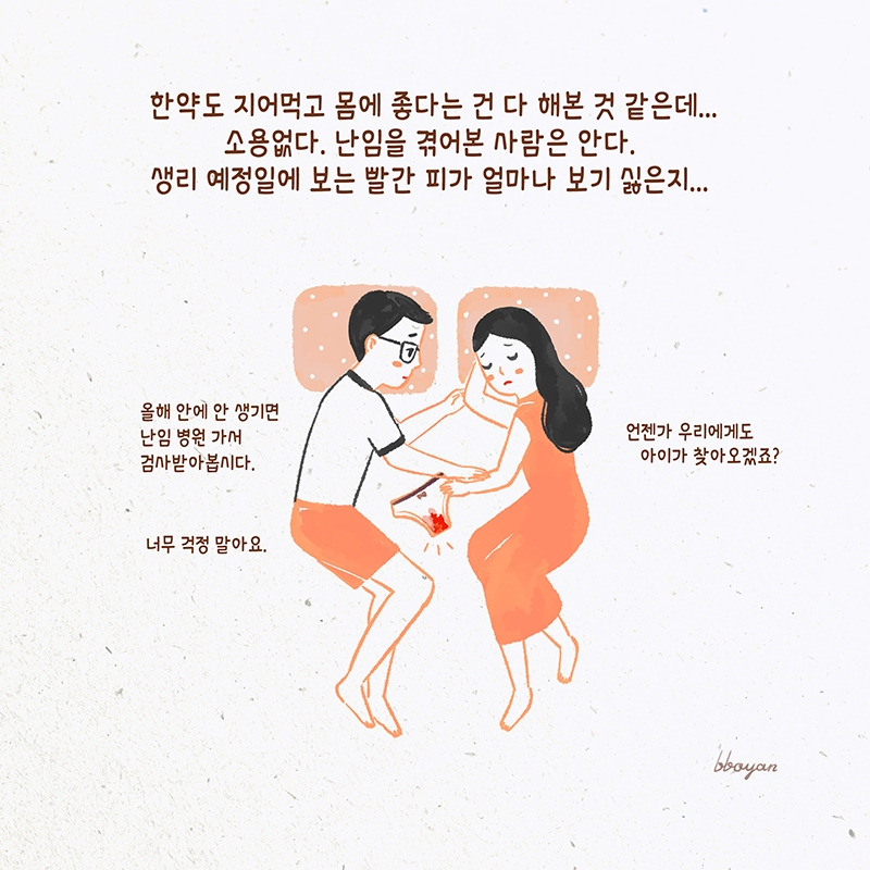결혼 초 1년 이상 자연 임신을 시도했으나 안 되었고, 이후 날짜 맞추어 시도하면 생기겠지 했는데 3년 넘도록 아이가 안 생겨 난임 병원을 찾아갔다. 착상에 방해가 될 수 있는 자궁벽에 붙은 근종을 절제하는 수술을 감행하고 나팔관 조영술을 진행하면서 진척이 없을 것 같은 우리 부부에게 아이가 찾아왔다. 5년 만에 처음 와준 너무나 귀한 아기. 오래 기다린 임신테스트기 두 줄 소식에 얼굴은 눈물과 콧물로 범벅이 되었다. 며칠 뒤 자궁벽에 조그만 점으로 자리 잡은 손톱보다 작은 형체의 심장소리를 들었을 때 심장이 멎는 줄 알았다.