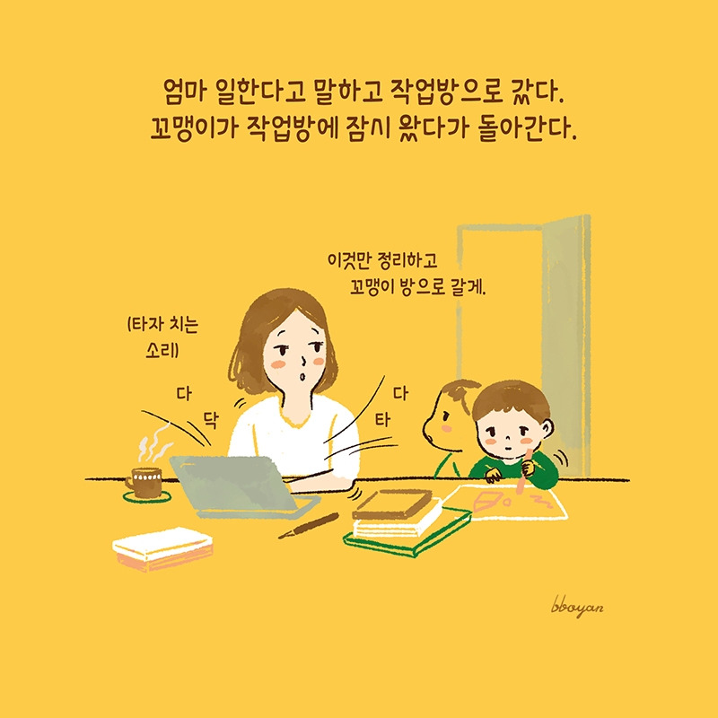 누가 들어주길 바라는 마음으로 내뱉은 것도 아니고 꼬맹이를 탓하기 위해서 말한 것도 아닌데, 솔직하게 말하고 속이 아주 시원했다. 꼬맹이가 타인을 공감하는 마음이 커져갈 때마다 건강하지 못한 내 마음앓이도 건강해졌으면 좋겠다. 꼬맹이도 나도 한창 성장 중이다.