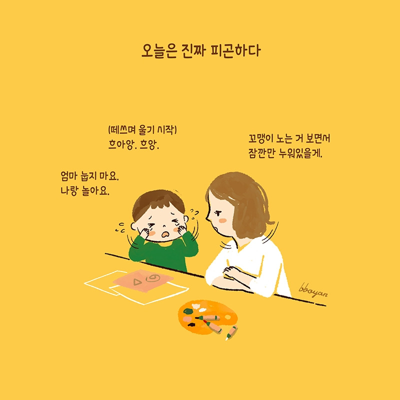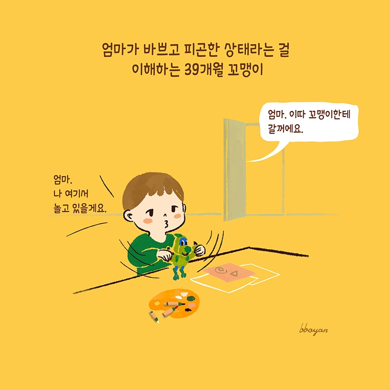 꼬맹이는 4살 중반을 넘어서니 감정과 생각이 더 뚜렷해졌다. 타인의 감정을 이해하는 능력도 조금씩 나타나고 있다. 자기가 아프면 "호오~"해달라고 하고 엄마가 아프면 아픈 부위에 입을 가까이 가져가 "호오~"소리를 내며 입김을 불어 준다.
