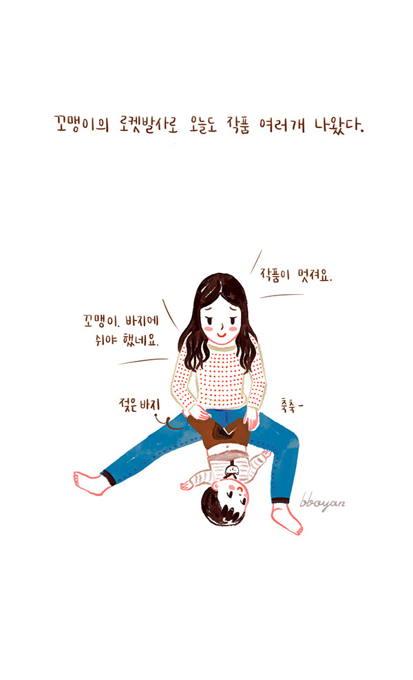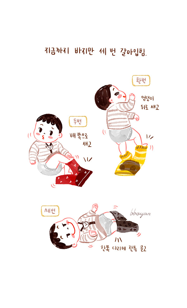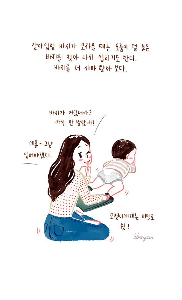 온종일 기저귀만 차고 있는 꼬맹이가 갑갑할까 봐 허리 밴드를 손가락 하나 들어갈 정도의 공간을 두고 채워왔다. 그런데 요즘 기저귀 새는 횟수가 늘더니, 오줌이 바지에 묻어 하루에 세네 번씩 아랫도리를 갈아주어야 하는 상황이다.