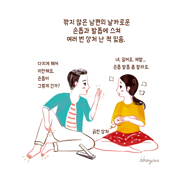 진짜 별거 아닌 집안일이 큰 싸움이 된다. 집안일에 대한 불만을 가진 내가 먼저 남편에게 행동 양식 시정을 부탁하고 (남편 말로는 ‘공격’) 남편은 "알겠어요. 미안해요."로 무마하지만 약속을 이행하지 않고 미루다가 수위가 더 높아진 잔소리 공격에 도망간다. 이런 말 해서 미안하지만 내 기준에서 나의 남편은 더럽고 게으르다. 그런데 우습게도 이 집안의 더러운 음식 쓰레기, 생활 쓰레기, 재활용품 같은 건 남편이 담당한다. 바로 행동하지 않고 미루고 미루다 버리는 경우가 대부분이다. ‘버릴게요.' 말하고 며칠 후에 버리는 식.