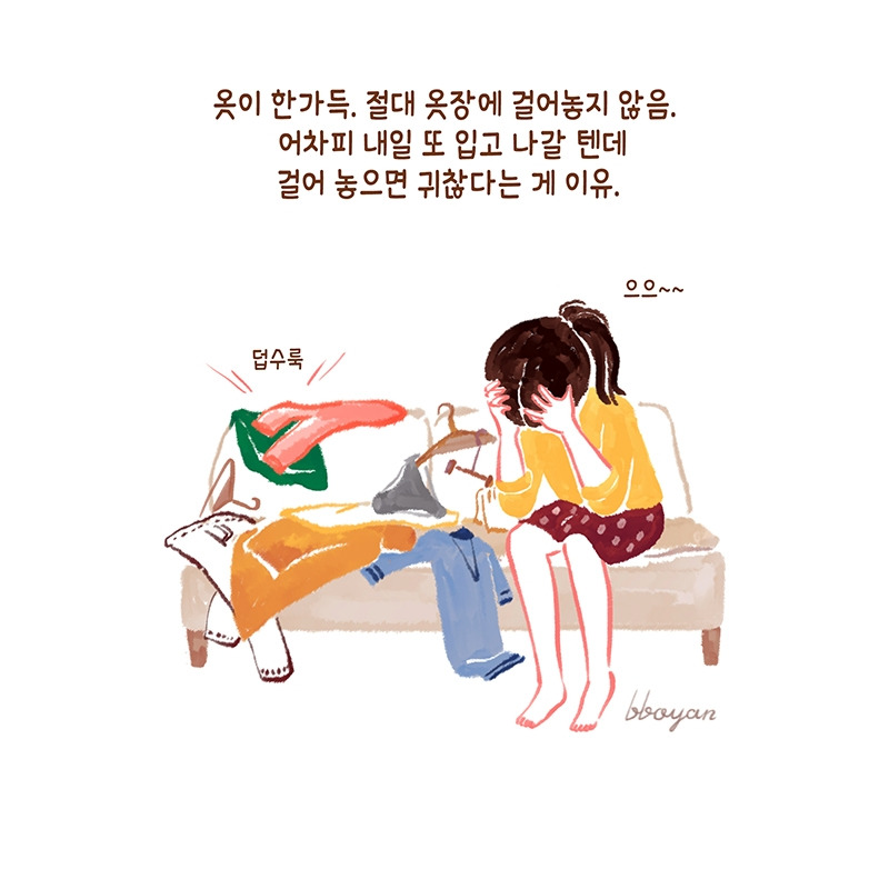 엄마에게 남편 이야기를 했더니 아빠도 똑같다면서 40년 한평생 치우라고 이야기했지만 고쳐지지 않았다면서 이해하고 살라고 한다. 쌓여있는 옷들, 바닥에 뭉쳐있는 머리카락, 아무 데나 둔 휴지와 쓰레기 사진을 찍어 남편에게 보여주고 이런 부분들은 개선되길 바란다고 이야기하면 며칠간 달라지는가 싶더니 원래 상태로 돌아온다.