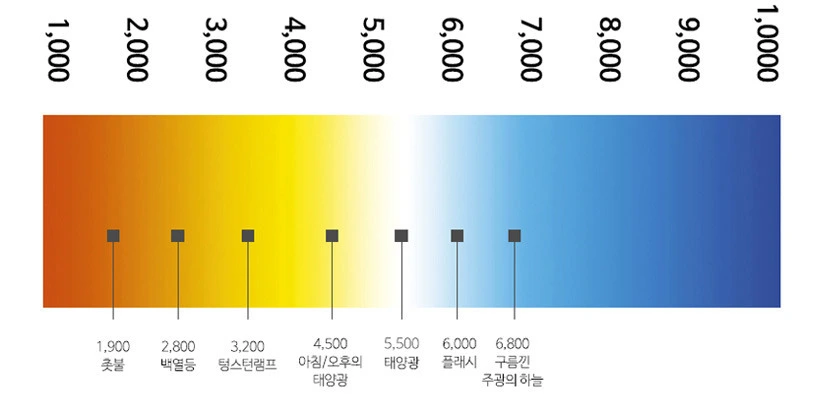 인테리어를 하거나 조명을 사본 사람이라면, 집에 있는 전구를 "전구색/주백색/주광색"중에 뭘로 할지 고민을 해보았을 것이다. 위 사진에서 볼 수 있듯이 색온도가 낮을수록 따뜻한 톤이, 색온도가 높을수록 차가운 톤의 빛이 난다.