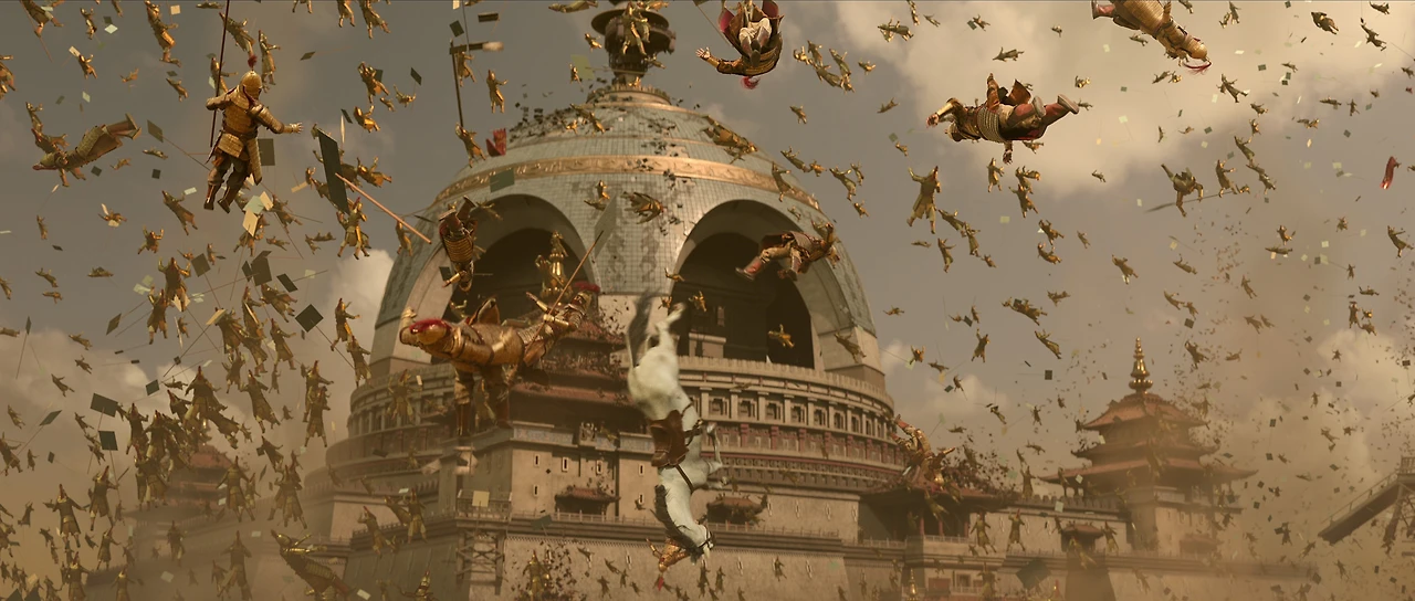 세 번째 에피소드에서 나오는 사원씬의 경우, 배우들이 연기하는 발코니만 세트로 만들고 이외의 모든 배경은 VFX로 만들어졌다고 한다. (저렇게 큰 돔 형태의 사원을 실제로 짓는다 생각하면 아찔하긴 하다.) 이 씬에서 수많은 병사들로 이루어진 '인간 주판'의 모습 또한 인상적이었다.