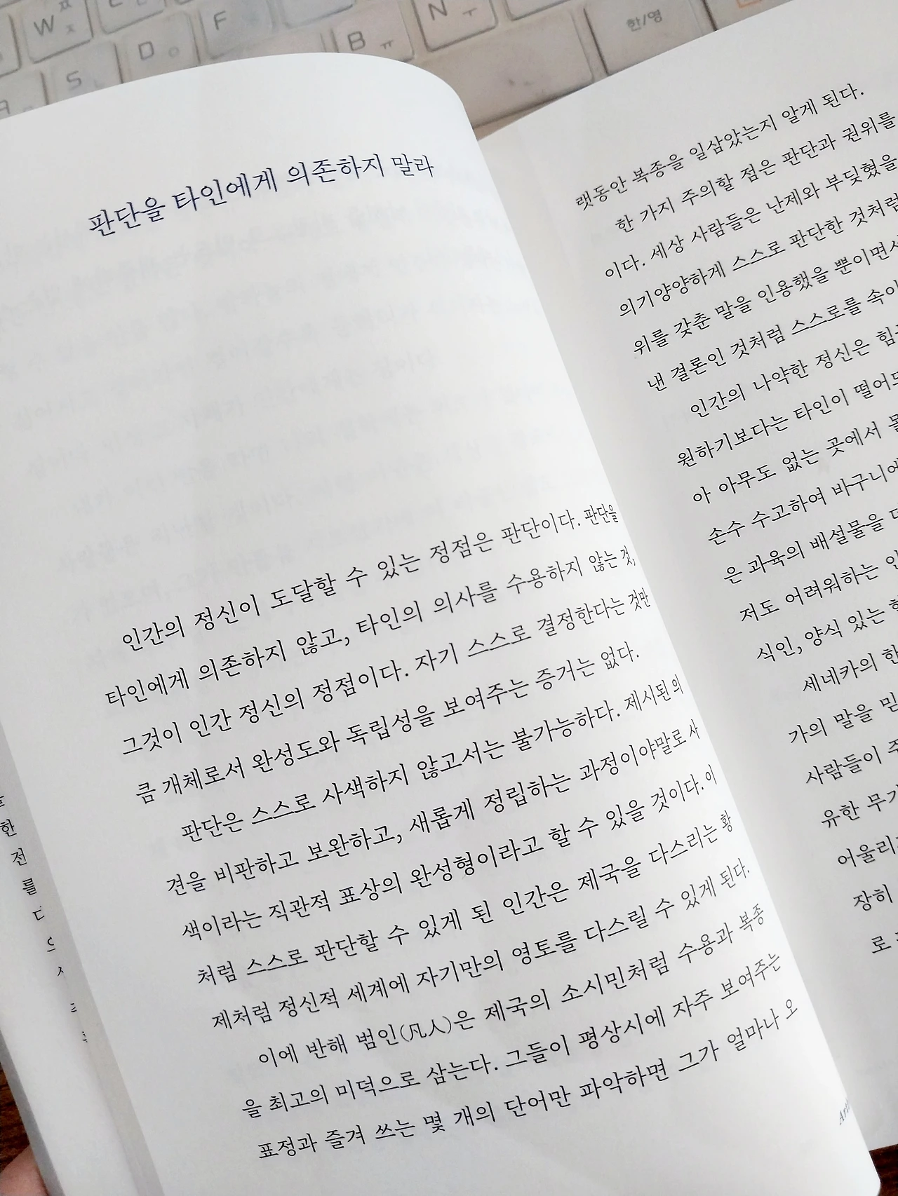 판단은 스스로 사색하지 않고서는 불가능하다. 제시된 의견을 비판하고 보완하고, 새롭게 정립하는 과정이야말로 사색이라는 직관적 표상의 완성형이라고 할 수 있을 것이다. 이처럼 스스로 판단할 수 있게 된 인간은 제국을 다스리는 황제처럼 정신적 세계에 자기만의 영토를 다스릴 수 있게 된다.