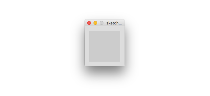 가로 세로 300픽셀 정도 사이즈의 정사각형 윈도우창이 뜨고 안에는 미니멀 작가의 작품과 닮은 회색 사각형이 그려져있다. 아무것도 없는데 실행이 된다. 이유는 코드가 어딘가에 감추어져 있다는 것이다. 보이지 않는 코드에 프로세싱의 의미가 있는 것이다! 예술가에게 창작 작업에 필요한 편의를 제공한다. 특정 사이즈의 윈도우가 만들어지고 회색 사각형이 표현되기까지 수많은 코드가 실행되었을 것이다. 다른 프로그램과는 다르게 프로세싱은 여기까지 자동으로 만들어준다는 데에 의미가 있다. 실행된 윈도를 닫고 싶다면 재생 버튼 옆에 있는 닫기 버튼 (진한 사각형 아이콘) 클릭히면 된다.