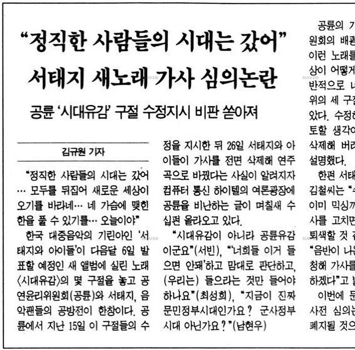 아이돌 변천사로 보는 활동과 노래 화두를 보니 서태지는 신비주의와 교육, 통일을 외치고 지드래곤은 자유분방과 유희, 랩몬스터는 팬친화적과 청춘의 성장통이라고 한다. 참 이 글을 보면서도 내가 가진 향수마저도 언론은 꼰대로 만드는 걸까 생각이 든다. 하지만 개의(介意)치 않는다. 서태지와 신해철은 나에게 신이었다.