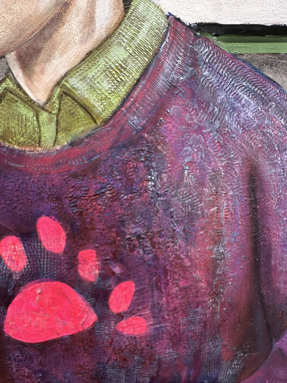 바스의 강점 중 하나는 회화에서의 색채 운용과 질감 표현이다. 그는 금박, 은박, 실크스크린, 아크릴 등을 병용해 회화의 표면에서부터 객체와 배경을 미묘하게 분리시키고, 감정의 흐름을 시각화해 왔다. 또한 반복되는 장식적 요소와 섬세한 레이어링을 통해 독특한 시각적 리듬과 긴장감을 형성해왔다. 하지만 이번 오컬트 주제에서는 그 시각적 밀도와 구성이 전반적으로 평면적으로 느껴졌고, 인물의 외곽선에 색을 집어넣어 신비로움을 강조하려 했던 방식은 오히려 그의 고유한 색채미학을 흐리게 만든 측면이 있었다.