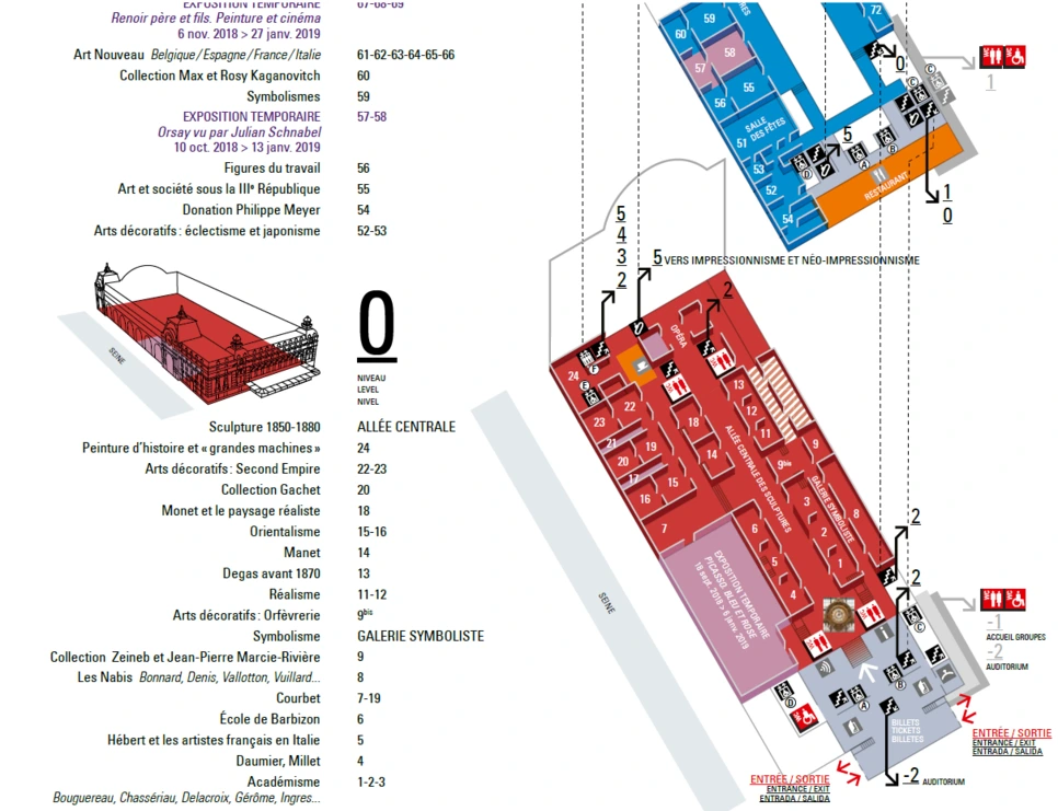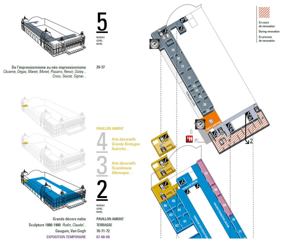 1900년 만국 박람회를 계기로 지어진 이 기차역 덕분에 프랑스 남동부 지역의 여행객들이 기차를 타고 파리 중심부에 도착할 수 있었습니다. 리셉션 홀과 화려한 호텔까지 마련돼 있었던 이 역은 철도 근대화와 함께 서서히 제 기능을 잃게 되었습니다. 프랑스 정부는 1977년 이 건물을 미술관으로 개조하기로 결정했고 1986년 드디어 오르세 미술관이 문을 열었습니다. - 미술관 안내 팸플릿