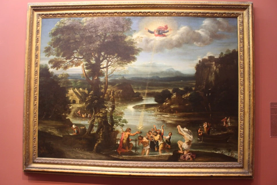 침례 요한이 요단강에서 예수에게 침례를 베푸는 광경. 하나님이 비둘기의 모습으로 형상화되어 있다. (1603년 작품)