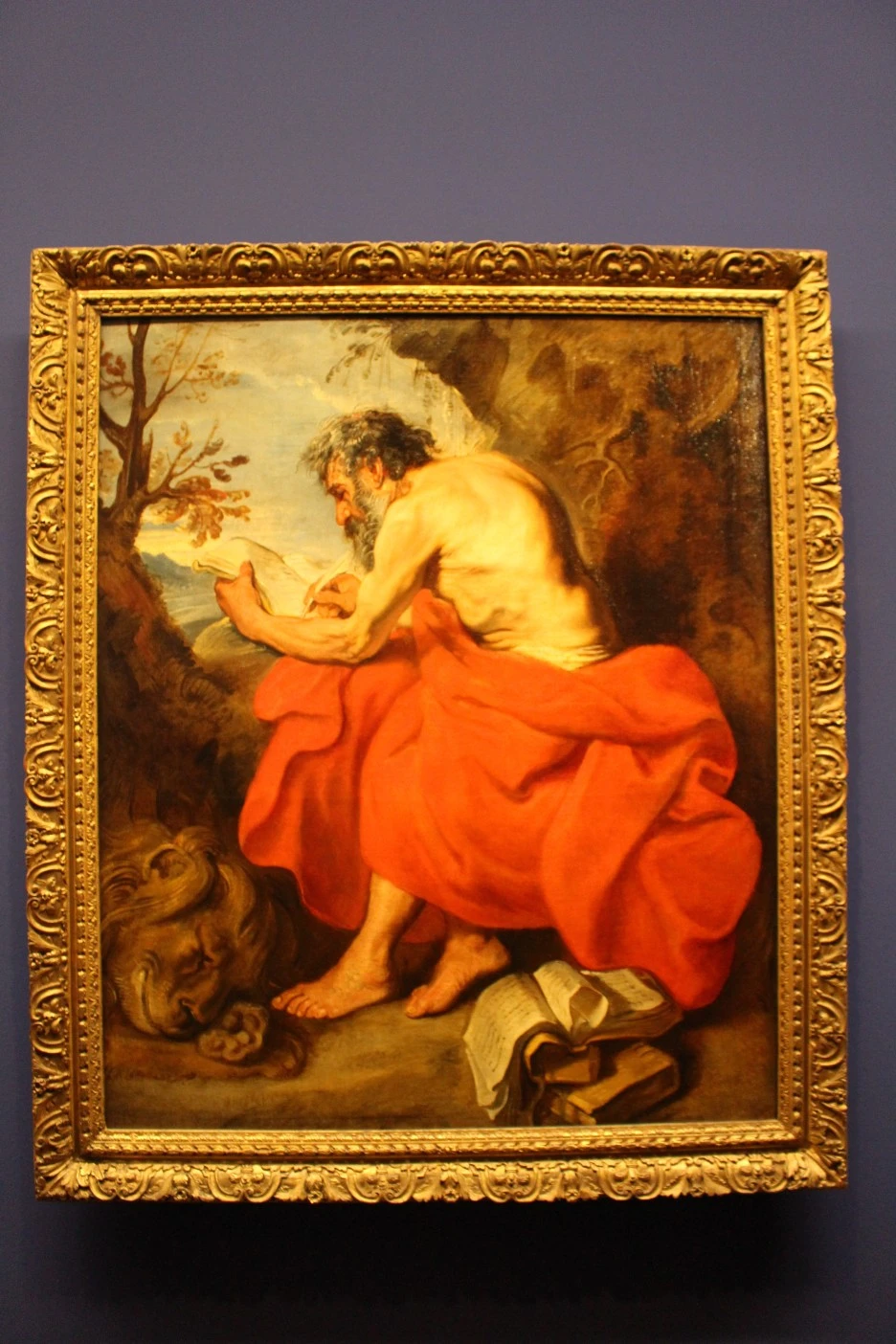 관람객의 시선은 아랑곳하지 않고, 무언가를 쓰는 모습에 몰두하고 있는 성 제롬.
