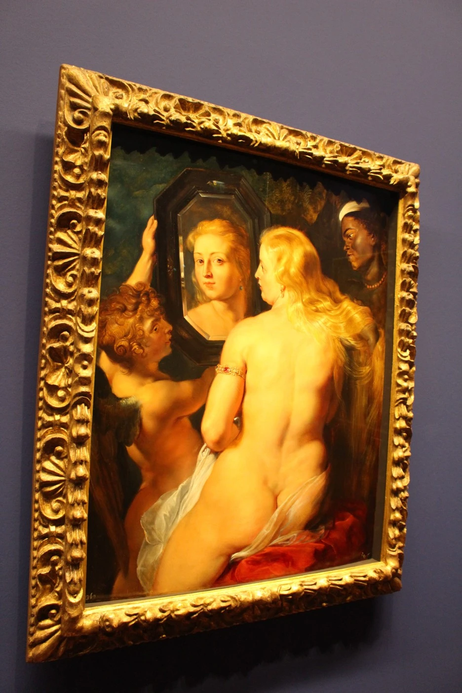 방금 목욕을 마친 '미의 여신' 비너스(고대 그리스어: 아프로디테)는 붉은색 오토만에 앉아 있고, 왼편의 날개 날린 아이, 큐피드(고대 그리스어: 에로스)가 엄마에게 거울을 보여주고, 곁에 하인이 그녀의 금빛 머리칼을 빗겨주고 있다.