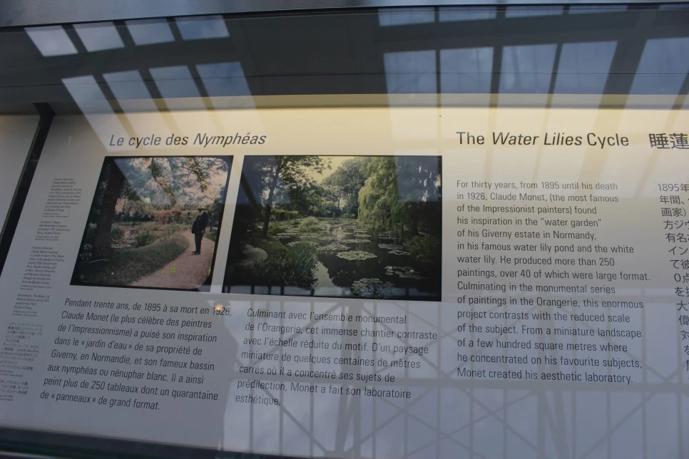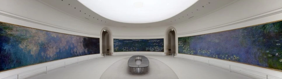 "제1차 세계대전 이후 모네는 조국 프랑스에 수련 연작을 기증함으로써 파리지앵들 마음에 안식을 주고, 무한한 자연의 심상을 그들 마음속에 잔잔히 떠오르게끔 하였다. 1909년 이 프로젝트를 처음 기획할 때 모네는 이렇게 썼다. "작업으로 긴장된 내 신경은 고요한 물의 흐름을 따라 휴식을 얻고, 이방은 내게 만발한 수련으로 가득한 평화로운 피난처를 제공할 것이다." - 미술관 팸플릿