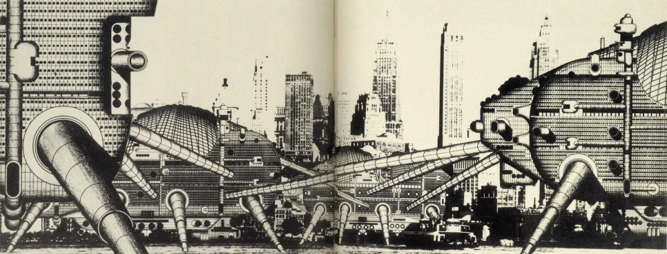 이러한 철제 구조물은 영국의 건축가 그룹인 '아키그램(Archigram)' 의 작품들에서 비롯되었다고 할 수 있다. 그들은 공상과학 theme에서 아이디어를 따와 철골 등 금속재료를 유연하고, 변형하기 쉽고, 움직일 수 있는 것으로 표현하는 것을 즐겨했던 그룹이다.