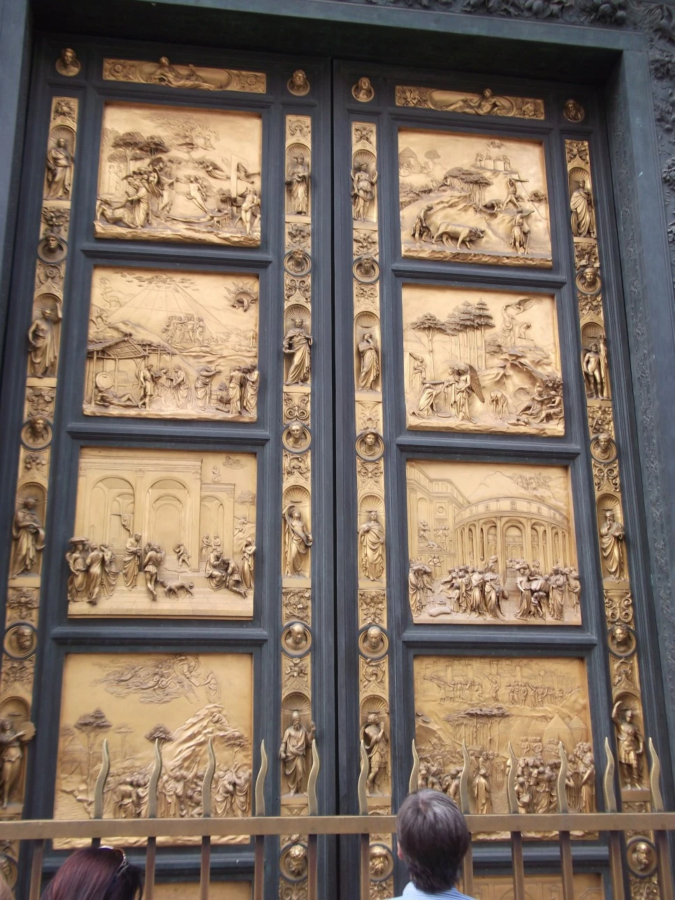 그는 피렌체의 성 요한 세례당에 있는 로렌초 기베르티(Lorenzo di Bartolo)의 금빛 화려한 '천국의 문'(아래)처럼 여닫이문을 의도했으나 결국에는 이처럼 문이 붙어있는 형태로 제작되었다.