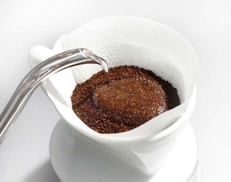 우리나라에서는 ‘뜸 들이기’라는 표현을 더 많이 쓰는데 이 과정을 통해서 원두 안에 들어있는 이산화탄소를 밖으로 뽑아내는 과정을 거친다. 위의 그림처럼 필터 안에 담긴 원두에 물을 부으면 분쇄된 원두 안에 있는 이산화탄소를 물이 밀어내면서 부풀어 오르는 모습을 볼 수가 있다. 일반적으로 분쇄된 원두는 2배의 물을 흡수하기 때문에 필터 안에 담긴 원두의 2배의 물을 부어서 뜸 들이기를 진행한다. 이 과정이 필요한 이유는 분쇄된 원두의 격자무늬 구조 안에 이산화탄소를 물이 밀어내고 격자무늬 벽면에 붙어 있는 커피의 향미 성분을 추출하기 위해서 물이 흐를 수 있는 환경을 만들어야 하기 때문이다. 이런 뜸 들이기 과정은 30초 정도를 기준으로 하는데 예를 들면 20g의 원두를 사용했다면 40g의 물로 필터 안에 담긴 원두가 골고루 적셔질 수 있도록 고르게 부어서 30초 동안 기다리면 된다. 기다리는 동안에 위의 그림의 오른쪽처럼 이산화탄소가 빠져나가는 모습을 눈으로 관찰할 수 있다. 이렇게 뜸 들이기가 끝난 이후 필터의 중심을 기준으로 고르게 물을 부어주면 추출을 하게 된다. 이런 뜸 들이기 과정을 요즘은 교반 과정과 섞어서 하는 모습을 많이 볼 수 있는데 예를 들면 초반에 뜸 들이기 정도의 물을 필터에 붓고 나무로 된 스틱이나 스푼을 사용해서 물과 분쇄된 원두를 저어 주는 과정을 말한다. 이런 교반 과정을 거치면 물과 접촉하는 과정에 외부의 물리적인 힘을 주어서 물이 더 원두에 고르고 잘 스며들게 할 수 있다. 하지만 커피의 맛을 일관성 있게 유지하는 데는 불리한 조건이기 때문에 이는 숙련된 바리스타가 자신만의 레시피와 루틴을 가지고 했을 때 의미가 있다고 생각한다. 개인적인 의견으로는 매년 열리는 브루잉 챔피언쉽에 나오는 많은 바리스타들이 뜸 들이기 과정 대신 교반 과정을 활용한 시연을 많이 하기 때문에 그런 듯하다. 이러한 방식으로 추출을 해 보았는데 개인적으로는 커피의 향미를 더 잘 뽑아낸다는 의견에는 동의하는데 재현성에서는 숙련도가 중요하다는 생각을 가지게 되었다.