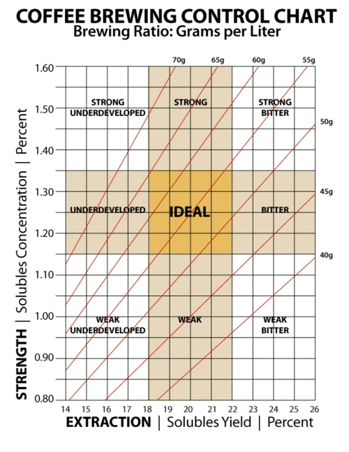 Brewing Coffee의 맛에 영향을 주는 요소들은 여러 가지가 있지만 그중 가장 중요한 것은 커피 원두와 물의 비율이다. SCA에서 기준으로 하는 것은 운두 50g~65g/물 1L이다. Brewing Control Chart를 다시 한번 살펴보면 50g에서 65g을 나타내는 직선 그래프들이 ‘IDEAL’ 영역을 지나가는 것을 볼 수 있다. 여기서 말하는 IDEAL 영역은 TDS 1.15-1.35%, Extraction 18~22% 사이를 말한다. 전에도 언급했지만 이 영역에 든다고 해서 무조건 맛있는 커피라고 말할 수는 없다. 그래서 바리스타들은 이것 이외에도 관능평가 능력을 키우는 것이다. 일단 브루잉 커피를 준비할 때 가장 먼저 설정하는 것이 원두와 물의 비율이라는 걸 말해두려 한다. 예를 들어 맛있는 라면을 끓이려면 면과 물의 양을 가장 먼저 잡아야 하는 것과 비슷하다고 생각하면 된다.