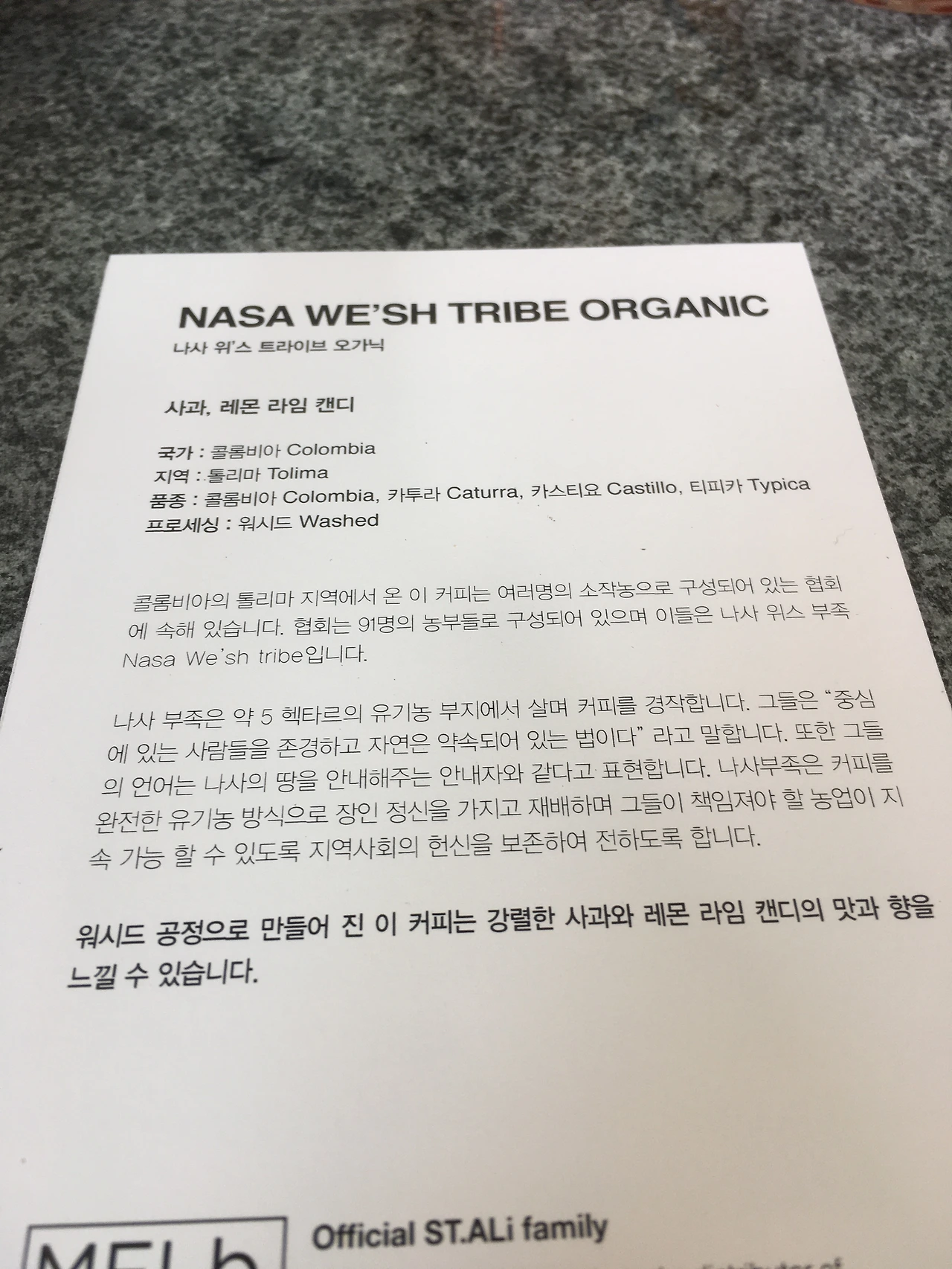 싱글 오리진 필터 커피도 ST.ALi에서 직접 농장과 거래해서 가져오는 좋은 원두들로 구성이 되어있다. 이 날은 콜롬비아의 워시드 프로세싱 원두를 마셨는데 컵 노트에 적혀 있는 향미를 그대로 느낄 수 있는 클린 컵이 좋은 커피였다. 다른 좋은 싱글 오리진 원두들도 시즌에 따라 계속 준비가 되고 있으니 꼭 마셔보기를 권하고 싶다.