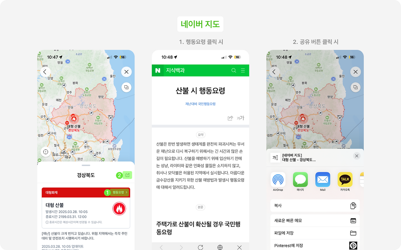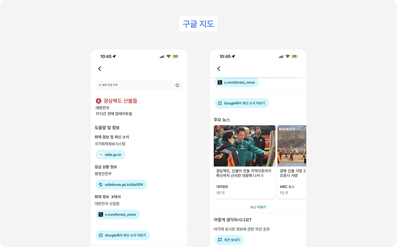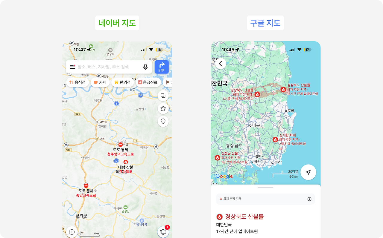 네이버와 구글 지도의 산불 현황 안내 방식을 확인한 결과,