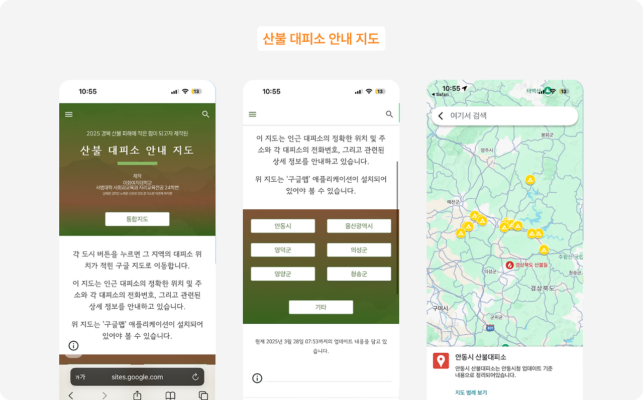 국민재난안전포털에서 제공한 재난 문자를 기반으로 산불 대피소를 구글지도에 태그 해 안내하고 있습니다.