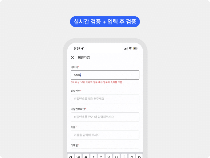 하지만, 실시간 검증 방식은 백엔드 요청이 필요한 검증(아이디, 이메일 중복 확인)은 실시간 처리가 어렵습니다.