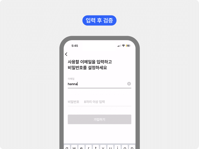 사용자가 입력을 완료한 후, 포커스 아웃될 때 에러 메세지를 표시하는 방식입니다.