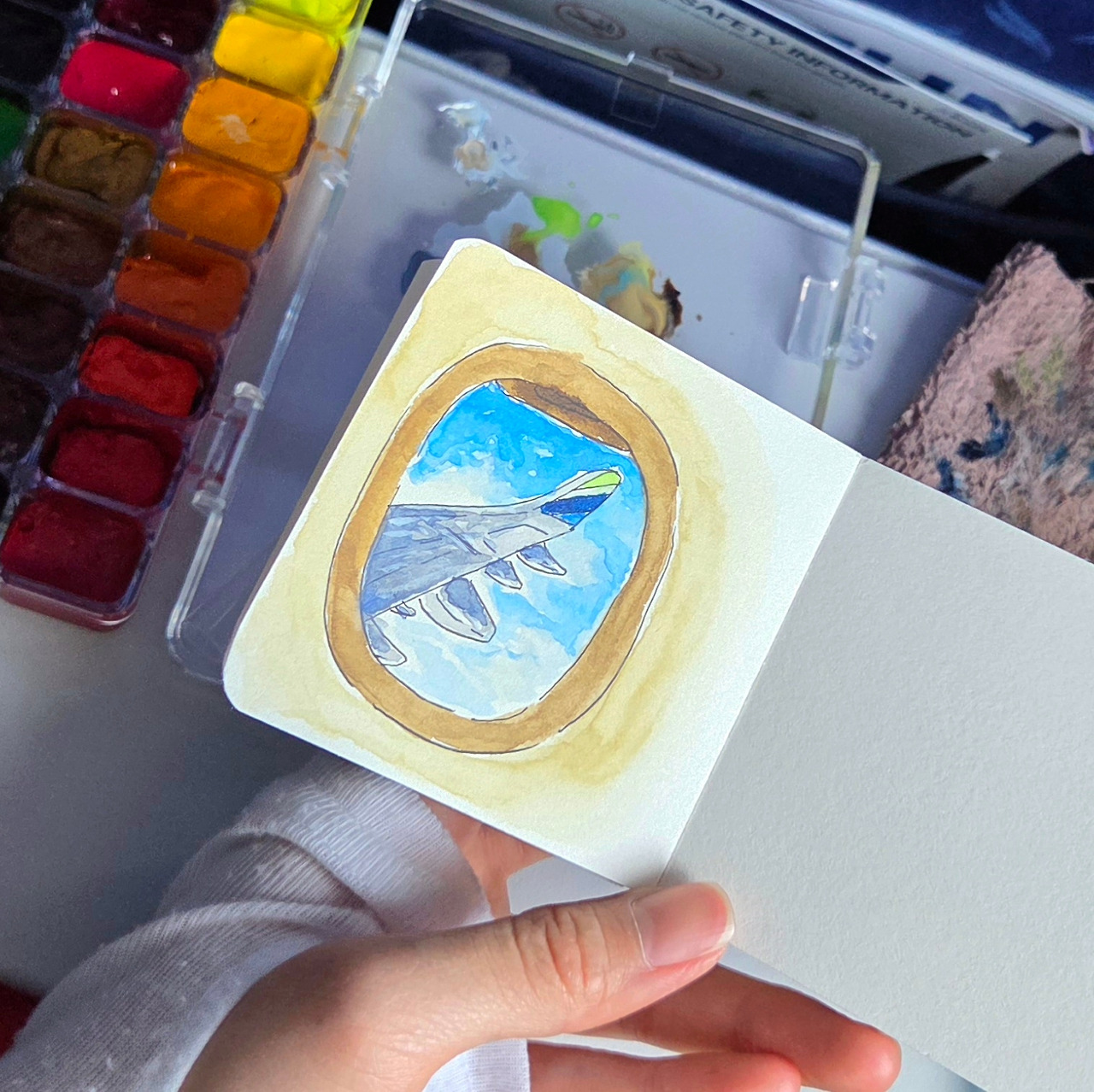 아침 7시 15분, 일본 후쿠오카로 떠나는 비행기에 올랐다. 이른 새벽부터 여행의 설렘으로 시끌시끌 북적였던 인천 공항을 떠나 가깝고도 먼 이웃 나라로 향했다. 이번 여행 기간 동안 틈틈이 그림을 그려보자 마음먹고 그림 도구를 챙겼다. 그리고 여러 로망 중 하나였던 '비행기에서 그림 그리기'를 이뤘다. 맑고 푸른 하늘과 목적지까지 안전하게 데려다주길 바라는 마음을 담아 작은 드로잉을 완성했다.