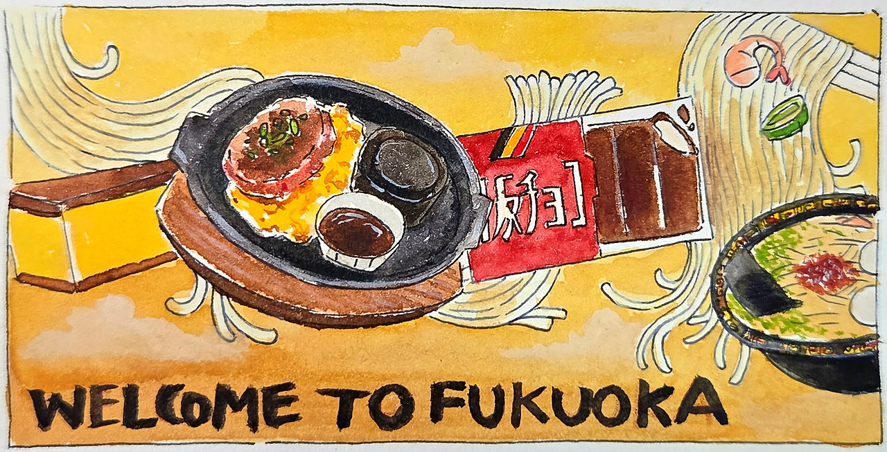 비행기에서 내려 짐을 찾으러 가는 길, 반가운 입국장 웰컴 벽을 발견했다. 여행 전 조사하며 알게 된 후쿠오카 대표 음식 중 하나인 돈코츠라멘과 유명한 일본 약들이 우리를 맞이한다. 일본에 온 여행객들을 반기며 즐거운 여행을 빌어주는 그림을 내 마음대로 바꾸어 그려봤다. 후쿠오카에서 제일 맛있었던 함바그와 라멘, 아이스크림과 카스텔라까지. 다녀와서 그린 거지만 내가 느낀 후쿠오카가 모두 이 안에 있다.
