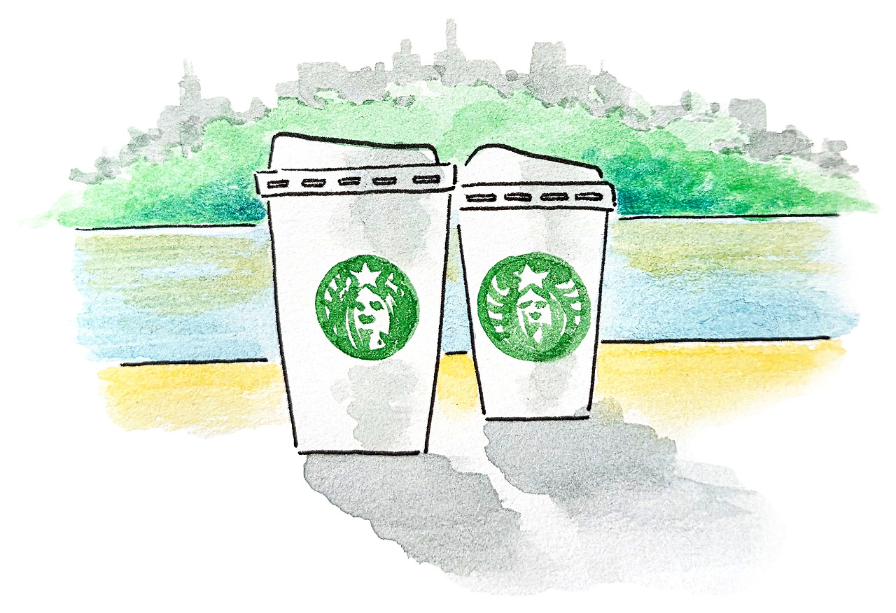 스타벅스 내부는 예상대로 꽉 차 있었다. 심지어 주문하는 줄은 카운터를 지나 문 밖까지 길게 이어져 있었고, 자리는 슬프게도 없어 보였다. 곳곳에 먼저 자리를 잡은 손님들이 즐비했고 대부분 호수를 바라보는 방향으로 앉아 있었다. 하지만 인생은 예상과 다른 재미를 맞닥뜨리는 일. 매장 중앙의 서로 마주 보며 앉는 길고 큼직한 테이블, 딱 두 자리가 남았다. 와, 재수다! 여기 앉아도 될지 눈치를 보며 슬쩍 가방을 내려놓는데··· 어라? 내 맞은편 자리의 한 외국인 남자와 눈이 마주쳤다. 근데 이 사람 눈이 튀어나올 듯 부리부리하다. 눈빛이 예사롭지 않다.
