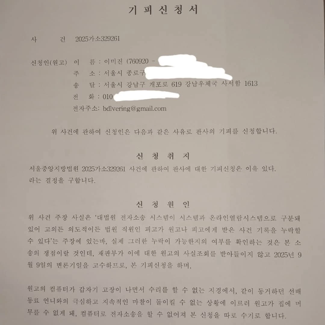 내일이 변론기일이라 늦어도 오늘 안으로는 기피 신청서를 제출해야 하는데, 통상 전자소송을 하는 경우 전자소송으로 제출해야 하나, 컴퓨터도 고장 났고 모든 서류도 집에 있는 터라, 집에는 9월 30일까지 들어갈 수도 없어서, 일단 기피신청서를 작성해서 이런 개인 사정을 소명했고요, 바로 변론기일 연기 알림이 오네요.