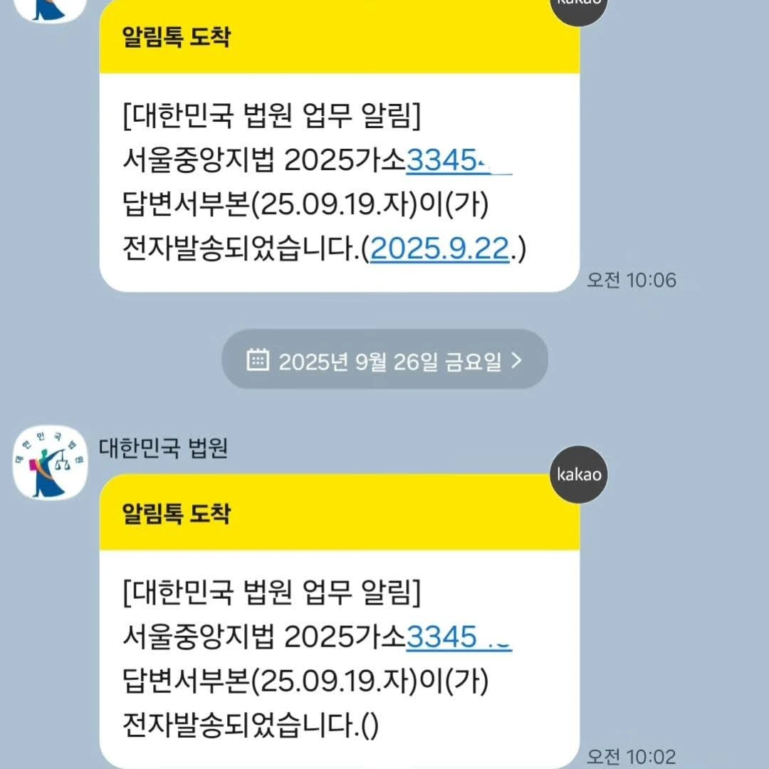 그런데 오늘 또 해당 재판부에서 같은 답변서 부본을 또 전자 송달했다며 카톡 알림이 오는데, 제가 분명히 동료 선배와 더 이상 같이 일하지 않기로 해서 동료 선배가 짐을 정리하고 나갈 9월 30일까지는 집에 들어갈 수 없어 전자 소송이 안 돼, 모든 서면을 당분간은 재판부에 제가 직접 찾아와 서면으로 받겠노라 영수증까지 작성했건만, 오늘 또 전자로 보냈더라고요.