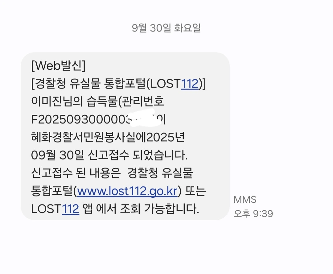 중간에 열쇠도 바꾸고, 결제하러 해당 매장에 방문하는 김에, 동네 홈플러스에서 먹을 걸 좀 사려는데, 갑자기 5만 원짜리가 눈앞에 떨어져 있어서 일단 주은 후에, 근처 혜화경찰서 민원실 (입구 경찰관 있는 곳)에 신고를 했는데, 현금이라 찾아가는 사람이 없으면 제가 가질 수도 있다고 하면서, 분실물 접수 사건번호까지 부여된 문자 올립니다.