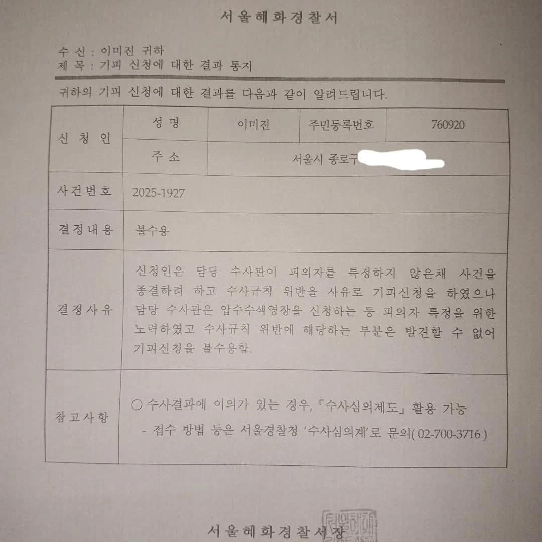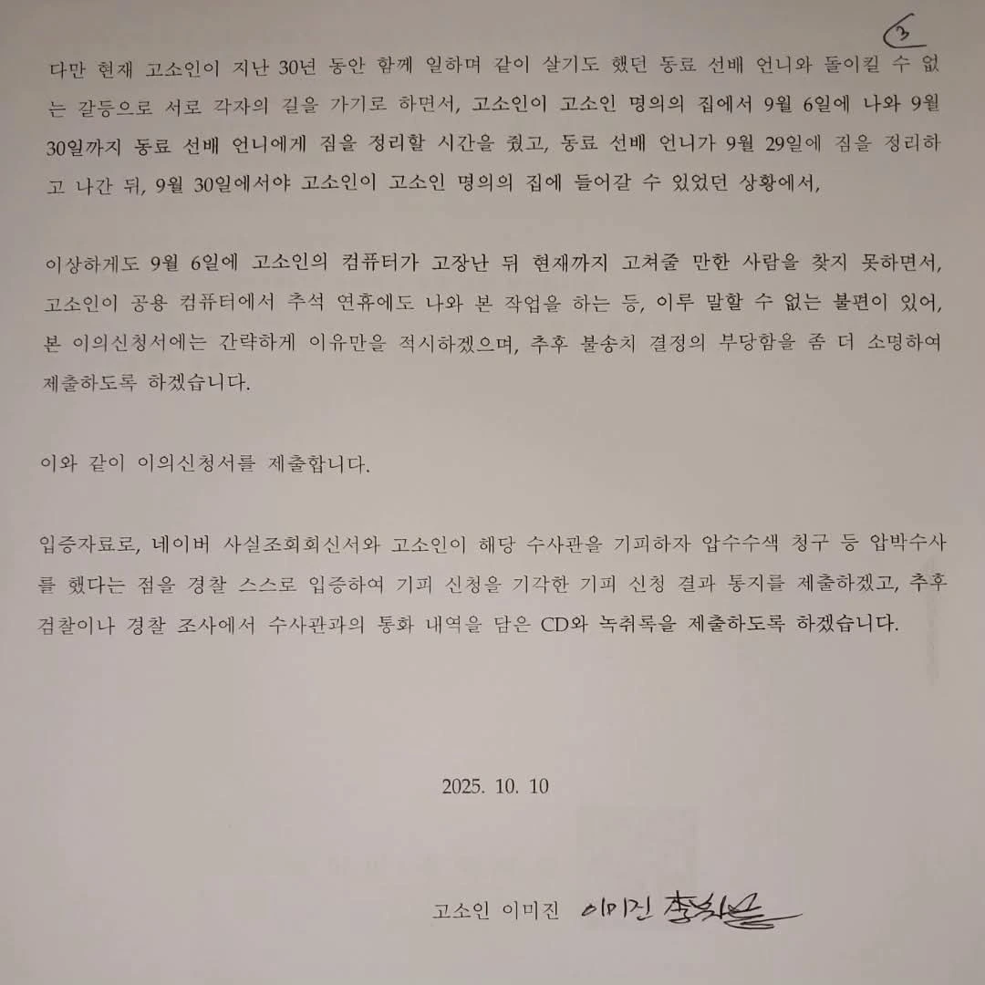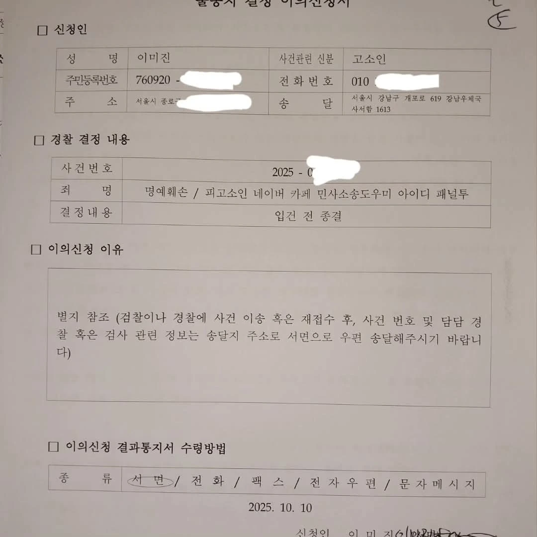 네이버 회원 이름 특정하자고 네이버를 압수수색한다고 하면 어느 검사가 동의를 하겠으며, 또 압수수색을 하겠다는 자체로 수사관도 일부 혐의는 인정한 거 아닌가 싶은데, 외래 일반인인 저도 법적 절차로 알아낼 수 있는 피고소인 특정을 수사관이 못해서 불송치라니, 여하튼 이런 이유로 이의신청서 작성했고, 10월 10일 제출해야죠. 변호사 고소장도 제출할 겁니다, 같은 날.