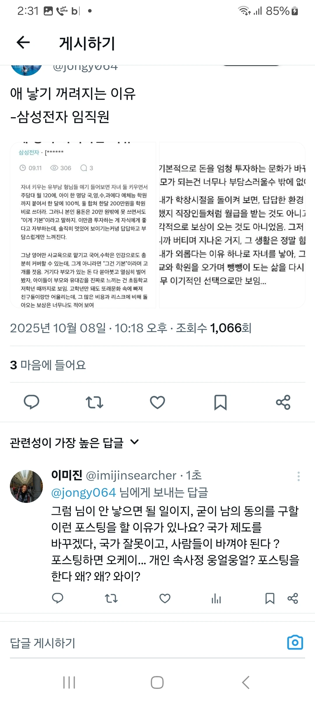 아이 낳는 게 사회 문제라 포스팅하면 오케이하겠는데, 뭔 삼성 임직원이 어쩌고 저쩌고 자랑질도 아닌 잡소리를 웅얼웅얼하면 뭘 어쩌라는 건지, 삼성 임직원은 자녀 교육에 몇 백 쓴다 부러워하라는 건가 뭔가, 대체 이런 쓰레기 글은 누가 써서 X 날리게 퍼다니고 공유하는 건가요?????