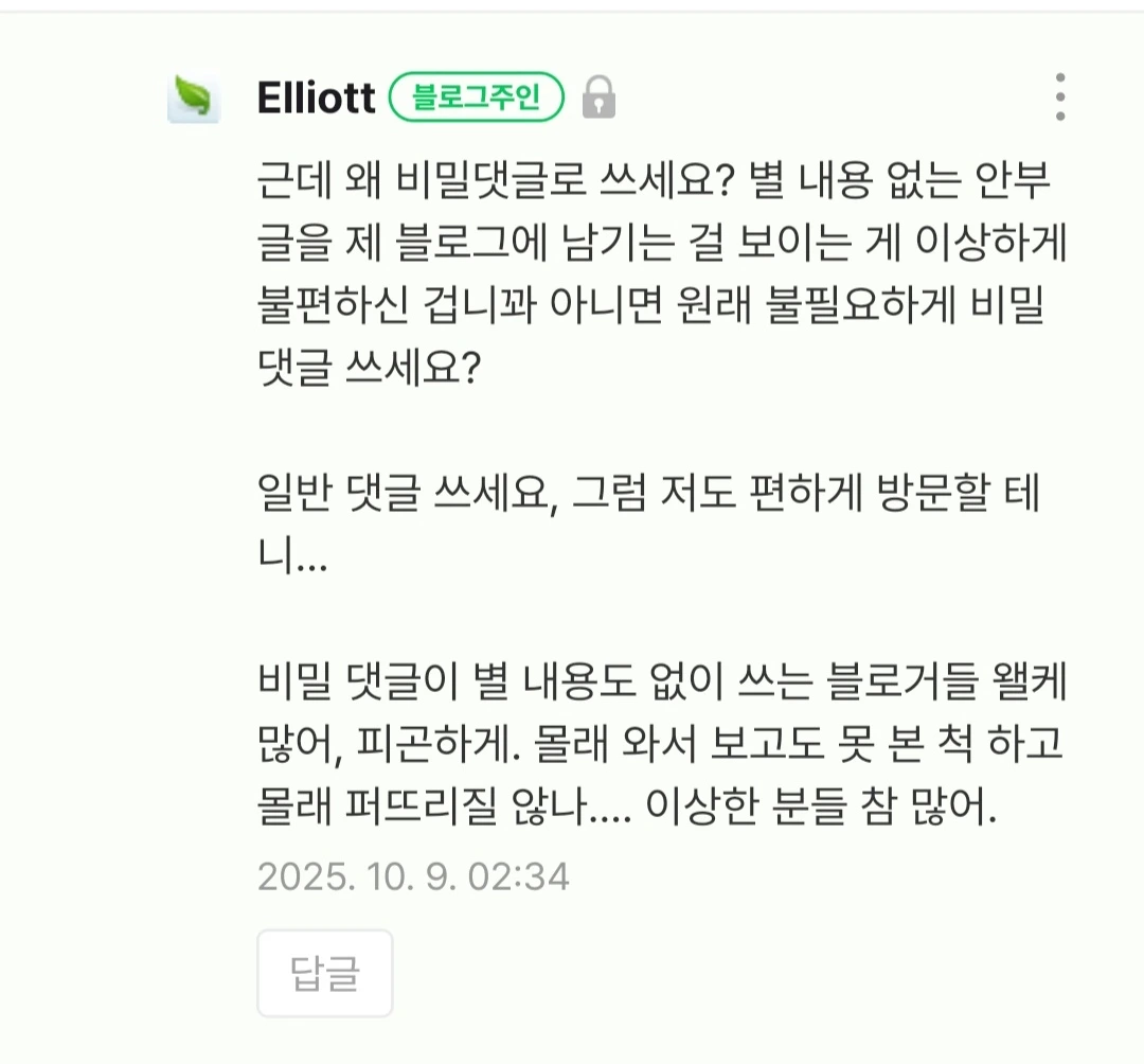 별 말도 아닌 비밀 댓글은 왜 자꾸 달까요, 개인 정보가 있는 것도 아닌, 누구나 보라고 만든 자기 블로그 방문해 달라는 비밀 댓글들 지겨워 죽겠어요.