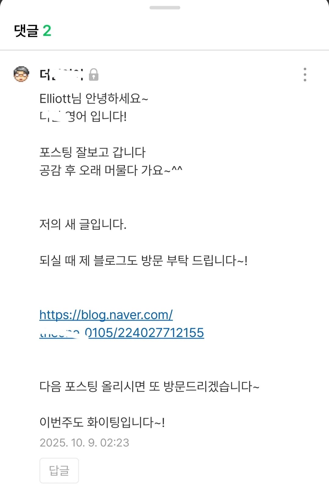앞으로 비밀 댓글은 특별한 개인 사정없는 단순 홍보, 안부 인사에 불과할 때 답변 안 합니다. 제 글 보고도 못 본 척하는 것들도 꾹 참고 넘어가고 있는데, 귀찮게 말이죠. 홍보를 이런 식으로 하는지, 원.