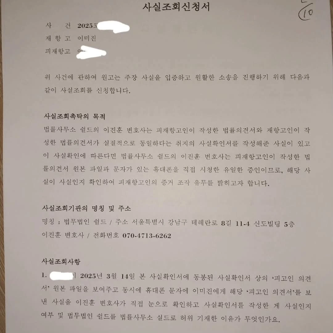 그런데 이 여성은 관련 민사 반소에 느닷없이 변호사가 <저와 이 여성이 쓴 글이 실질적으로 동일하다> 확인해 준 서면만을 제출했으며, 이 여성이 쓴 글은 아직도 제출이 안 된 터라, 이 민사 반소에 제출된 사실확인서를 사실확인해 달라 대법원에 사실조회한 내용입니다.