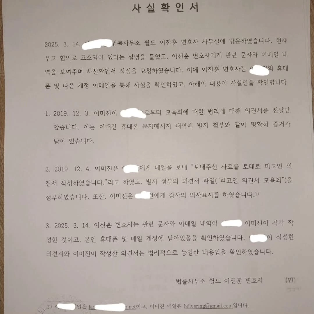 제가 모욕죄로 기소된 당시 이 여성에게 법률 의견서를 받은 건 사실이나, 이 여성이 작성해 준 법률의견서는 이 여성의 평소 다른 서면에서도 보듯, 조악하고 문장도 앞뒤가 맞지 않으며 내용 또한 추접하여 제가 <고맙다> 형식적 답변만을 보낸 뒤, 일부 몇 문장을 제가 완곡하게 다듬어 제출한 외에, 참고로 한 사실이 없습니다만, 이것도 찾아보니, 예전에 제가 썼던 내용인 건 일단 차치하겠습니다.