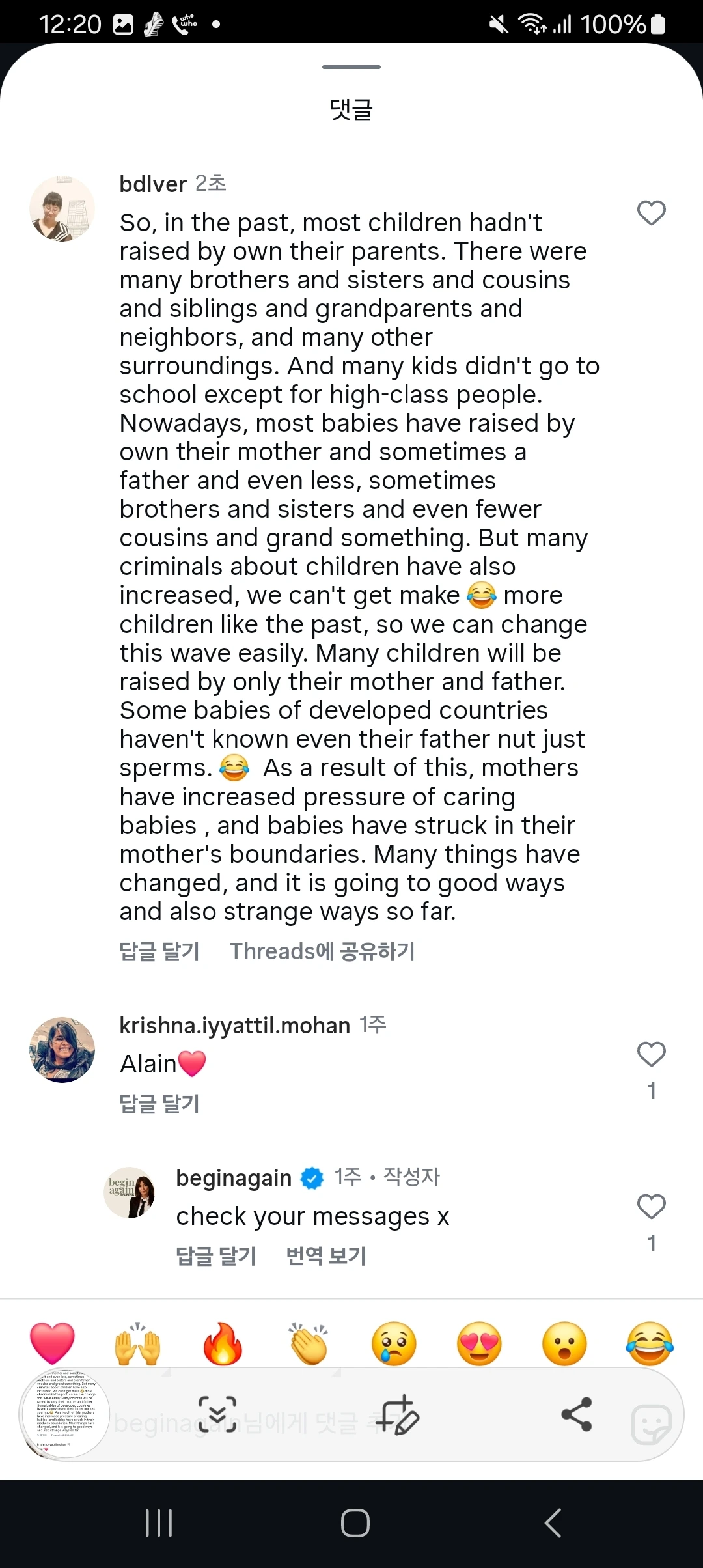 영어 댓글 중간에 긍정 부정이 섞이긴 했는데, 내용은, 예전엔 상류층만 학교에 갔고, 대부분은 많은 형제와 친척과 이웃과 어른들 속에서 어려서부터 자랐기 때문에, 부모만의 양육이라는 개념이 없었다는 거죠.