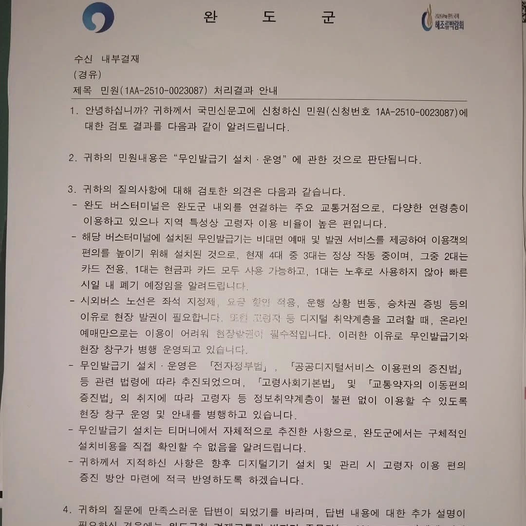 원칙적으로는 중앙정부에서 완도군에 고속터미널 현장 이용객 수에 대해 조사를 의뢰하고, 창구를 유지하는 것과 키오스크 설치 비용 중 고용 청출과 비용 절감 양 측 입장을 조율해, 현금과 카드 결제가 가능한 키오스크 사용 적정 갯수를 추정해 설치했어야 하며, 맥도날드처럼 젊은 층이 키오스크를 많이 사용해도 3대 이상 설치된 곳을 찾기 힘든데, 4대나 설치하고 없애는 낭비는 없었을 겁니다.