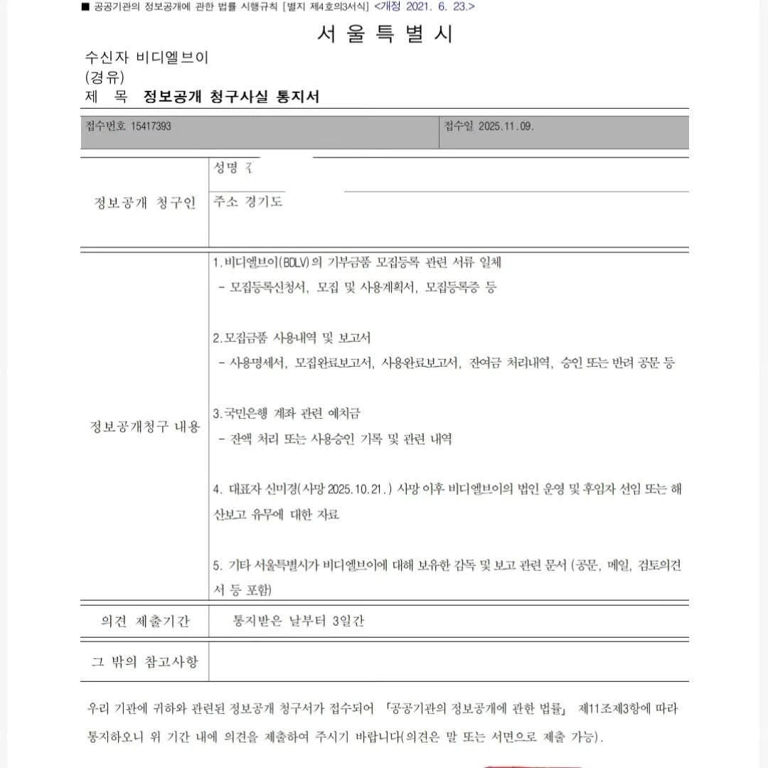 기부금품 법에 따라 기부금을 모집하려는 기관은 일정 정보를 반드시 공개하도록 돼있어, 일부 사실은 이미 블로그 등에 공개 중인 터라 비공개할 이유가 없고, 나머지 정보는 서울시가 갖고 있지도 않으며, 무엇보다 동료 선배 언니는 이름이 신미경도 아닐 뿐더러 사망 하지 않았으나, 온갖 불쾌 요소를 적시한 정보공개 청구 앞에,