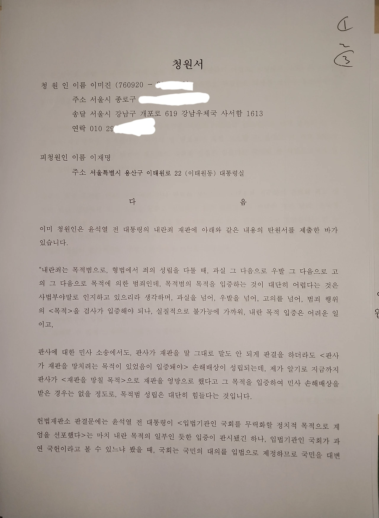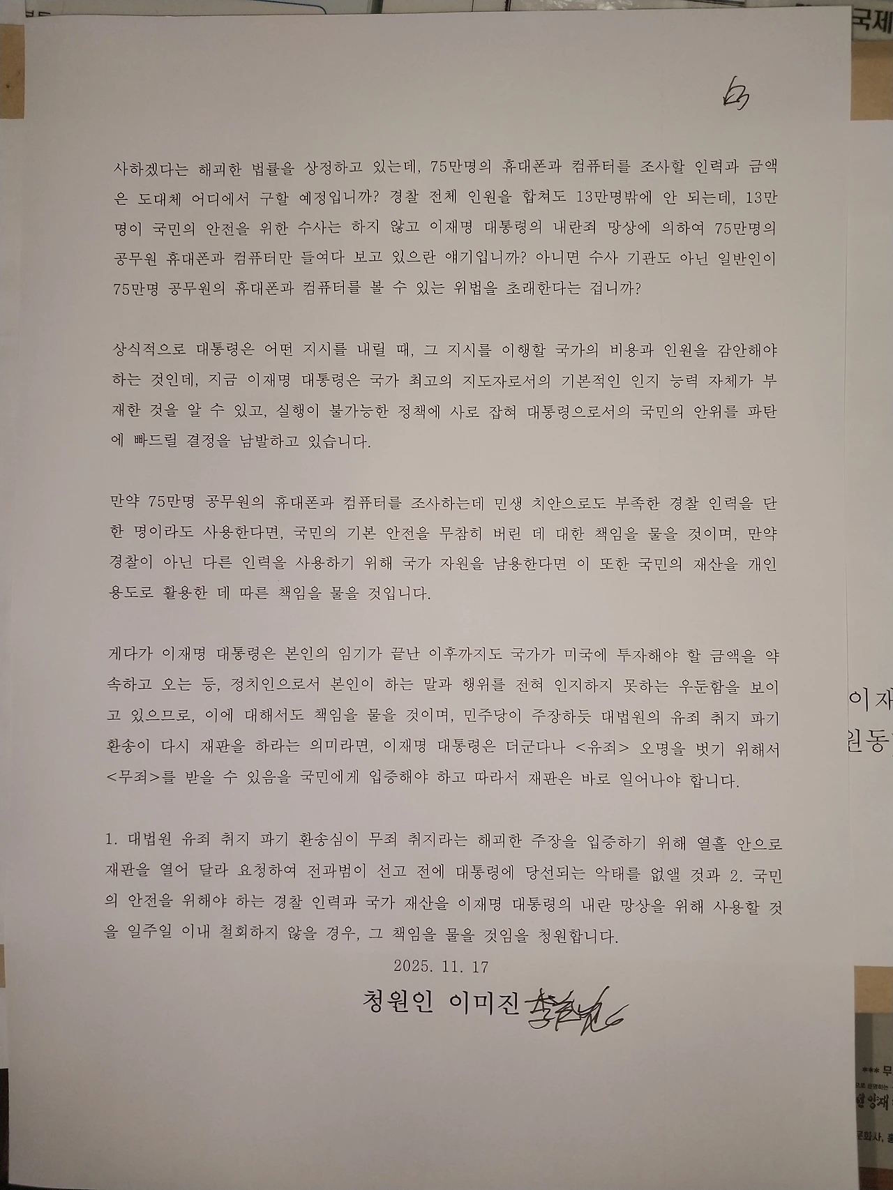 따라서, 누차 말해온 것처럼 이재명 대통령은 더 이상 참을 수 없는 악태로 국민의 안위마저 위협하고 있기에, 내용과 같은 청원서를 우편으로 보냈습니다.