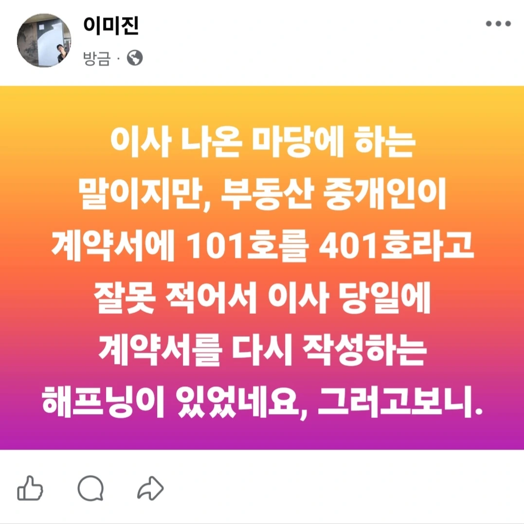 이사 나온 집 계약서에 101호가 401호로 작성됐었음