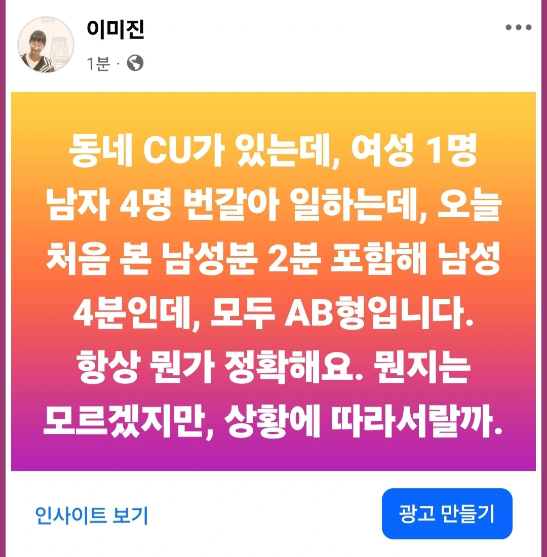 심심한 김에, 동네 CU 점원분들 혈액형도 추정해봅니다