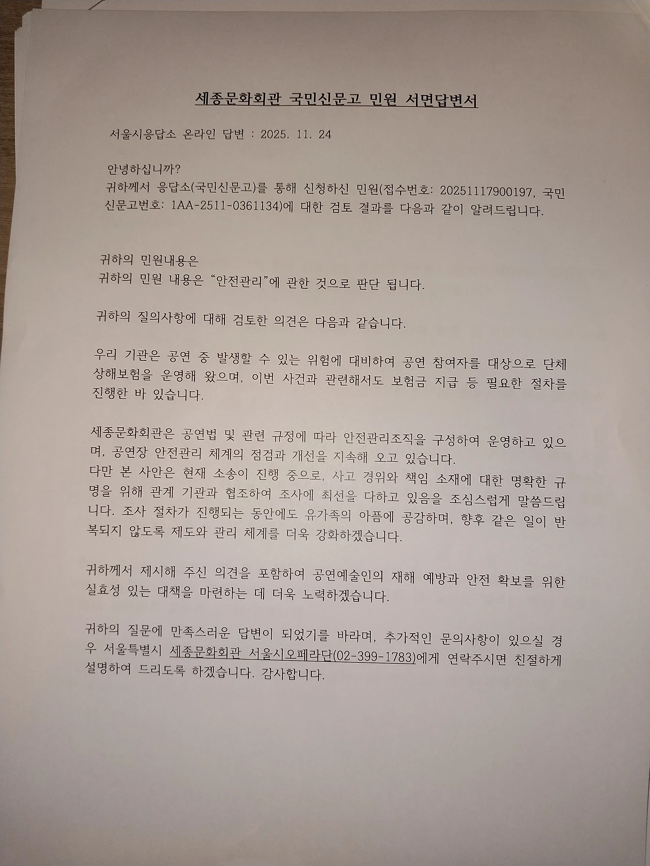 그 의견을 보내니, 세종문화회관은 공연팀에 상해 보험을 들어놔서 이미 지급을 했고, 정확한 사고 원인 규명을 위해 소송 중이라는 답변이 왔는데, 이게 제가 말한 안전 상의 책임은 최종 세종문화회관에 있다라는 의견의 반영인지는 모르겠습니다.