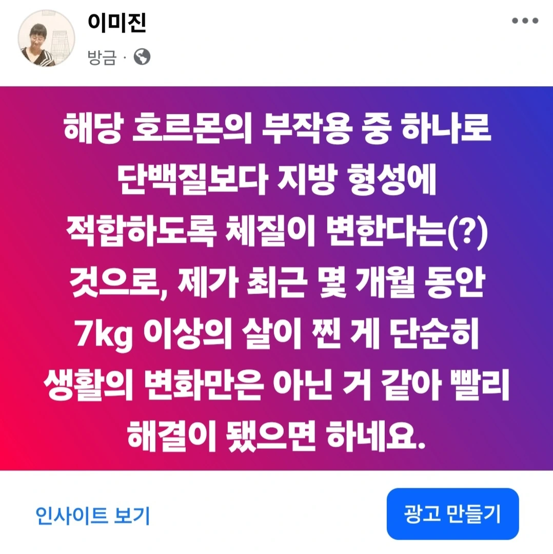 해당 호르몬의 부작용 중 하나가 지방 증가입니다
