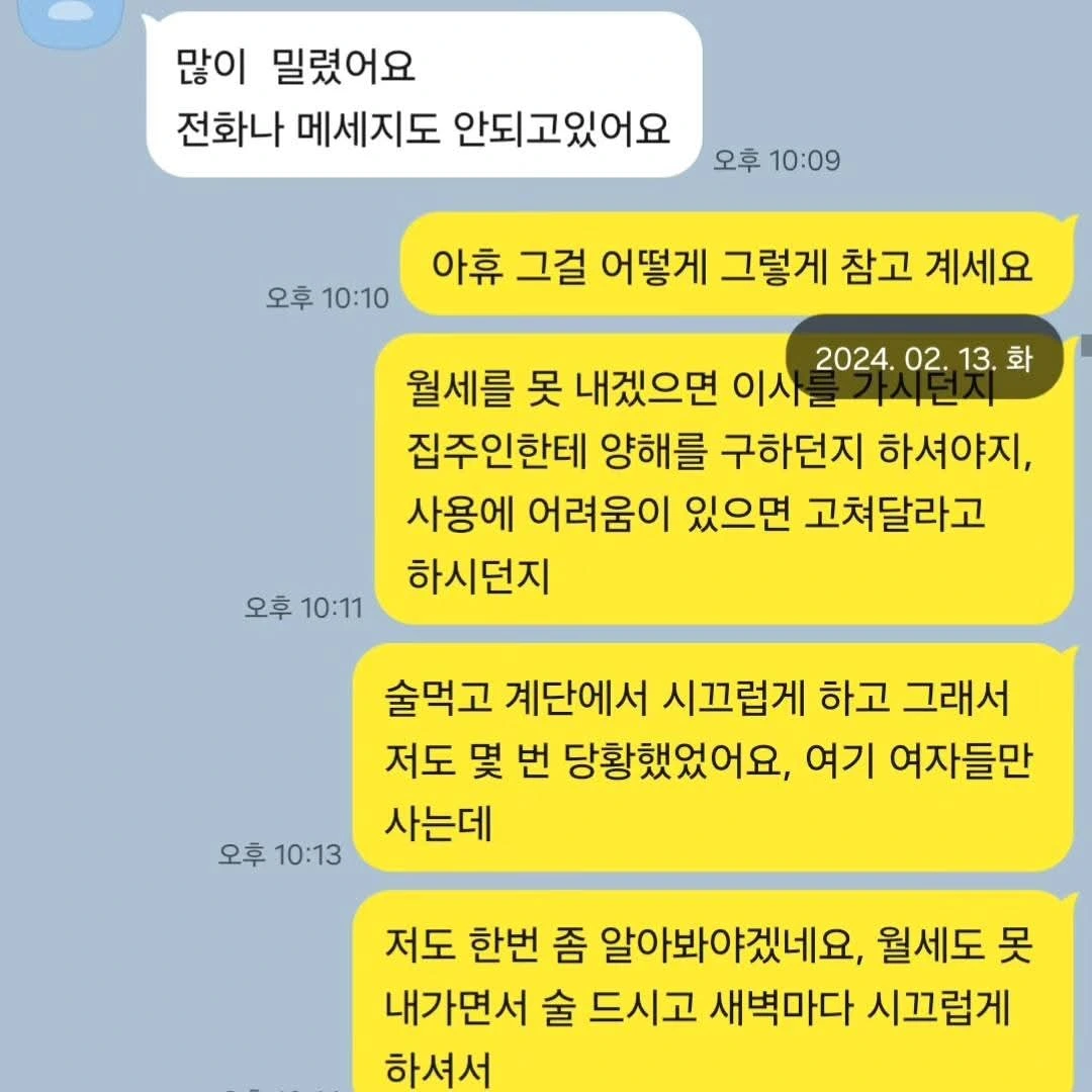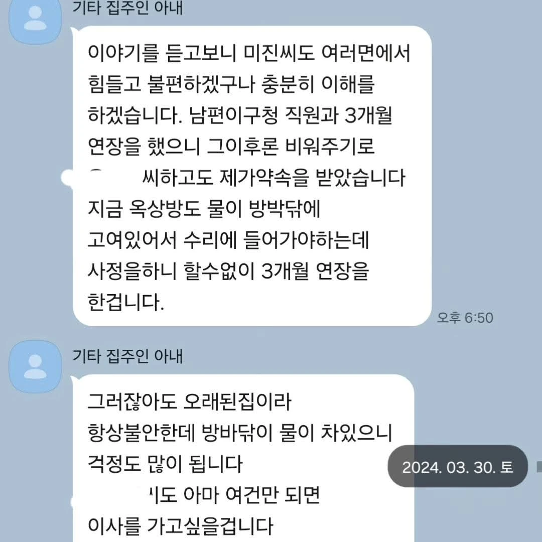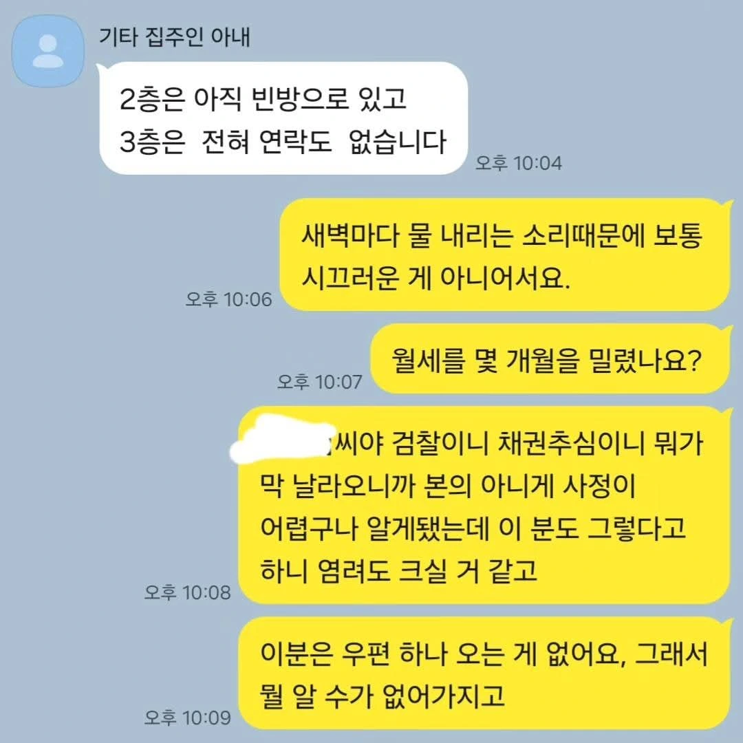 층간 소음이 너무 시끄러워 집주인에게 말할 때마다 집주인은 평소 월세가 됐든 뭐가 됐든 늦은 적 없고 외레 수돗세 등 관리 잘하는 제 주장을 인지했으며, 그 때마다 3층 바닥에 물이 고여 있어 시급하게 수리를 해야 하는데, 3층이 나가질 않아 수리도 못 하고 있다는 입장이었습니다.
