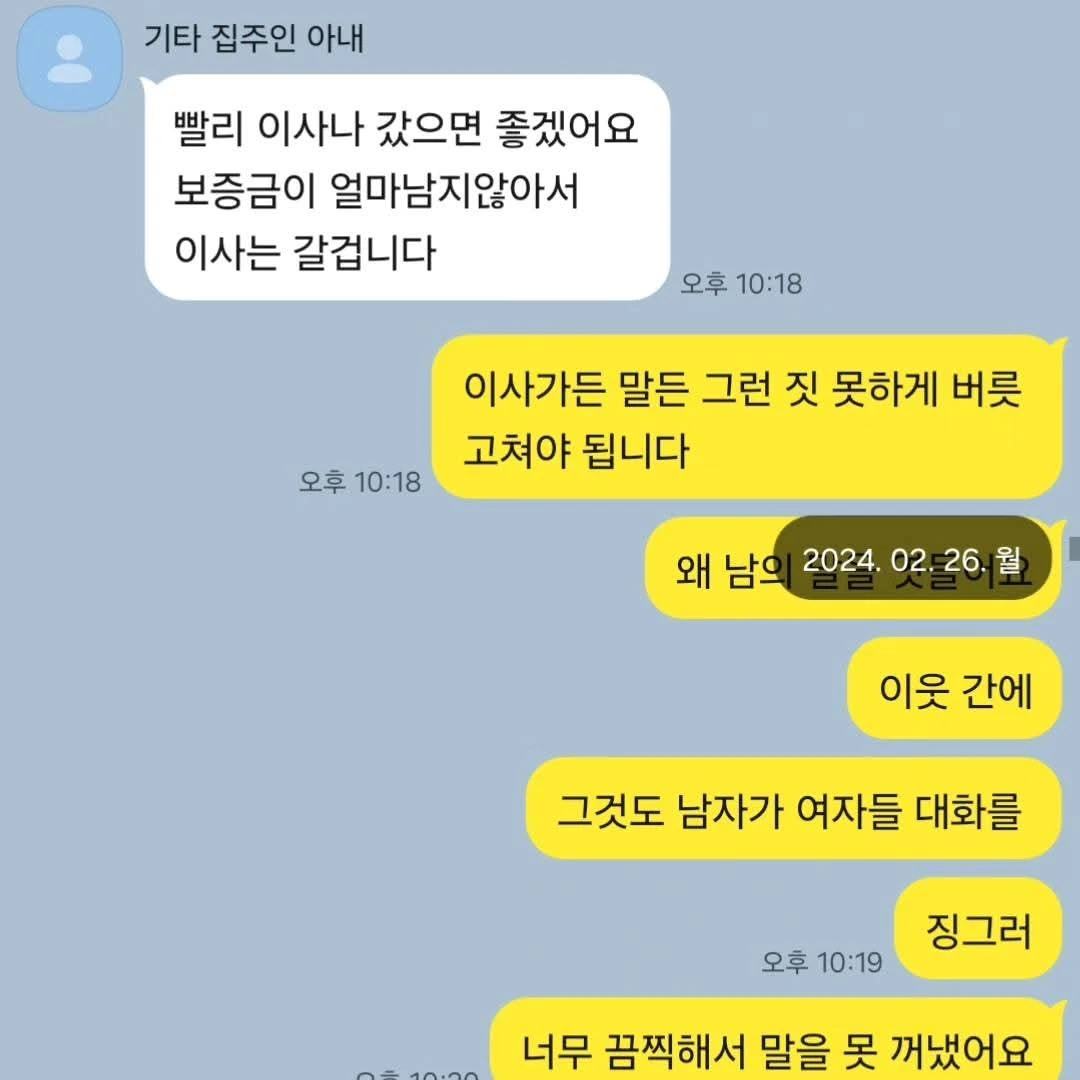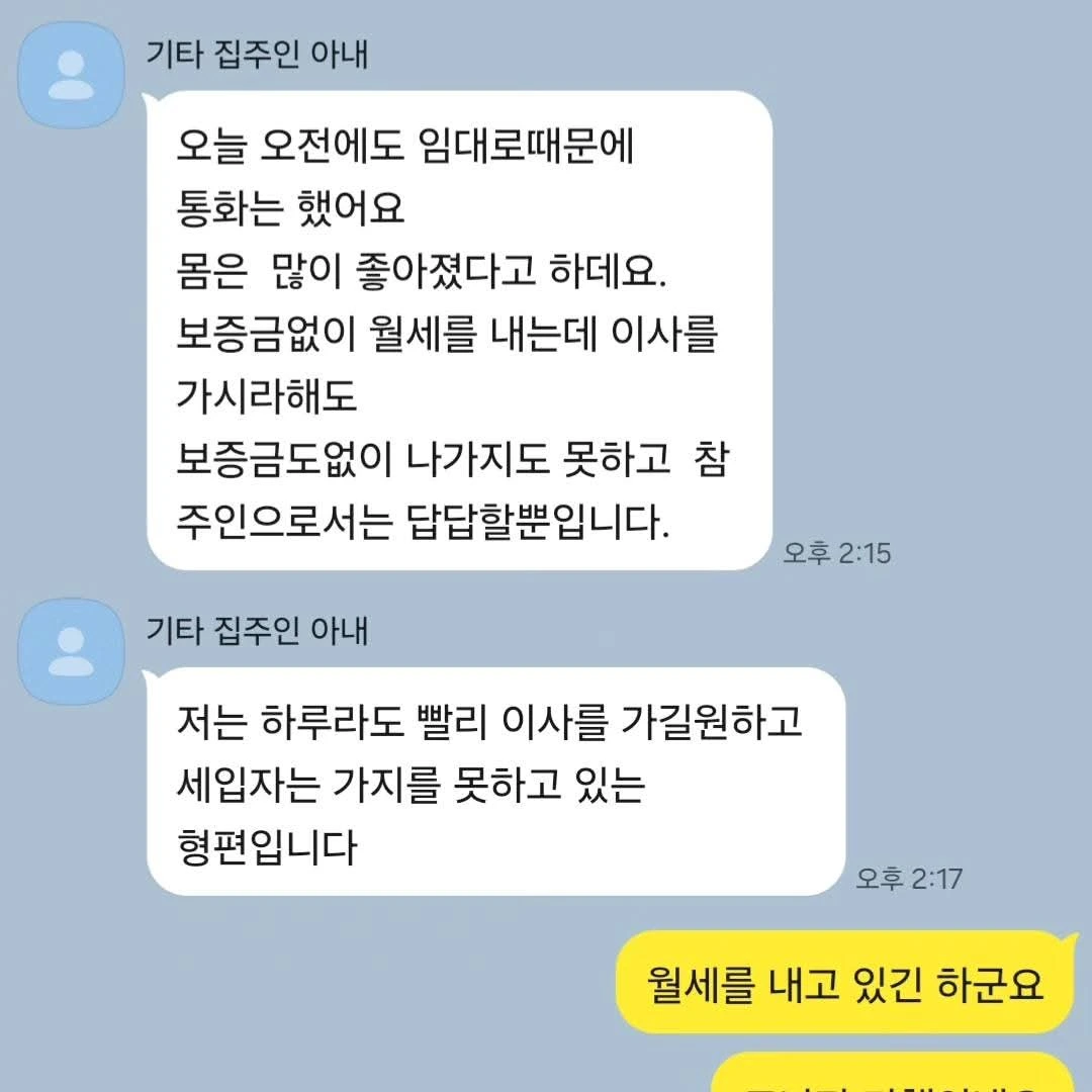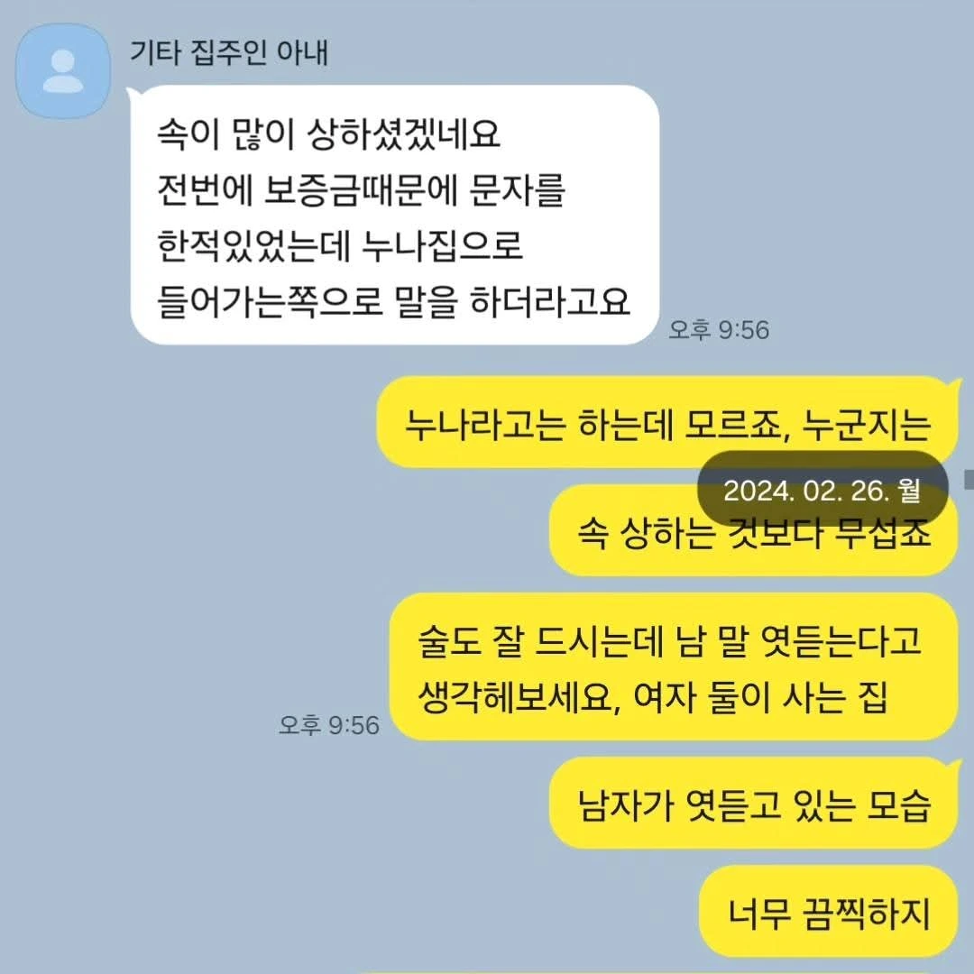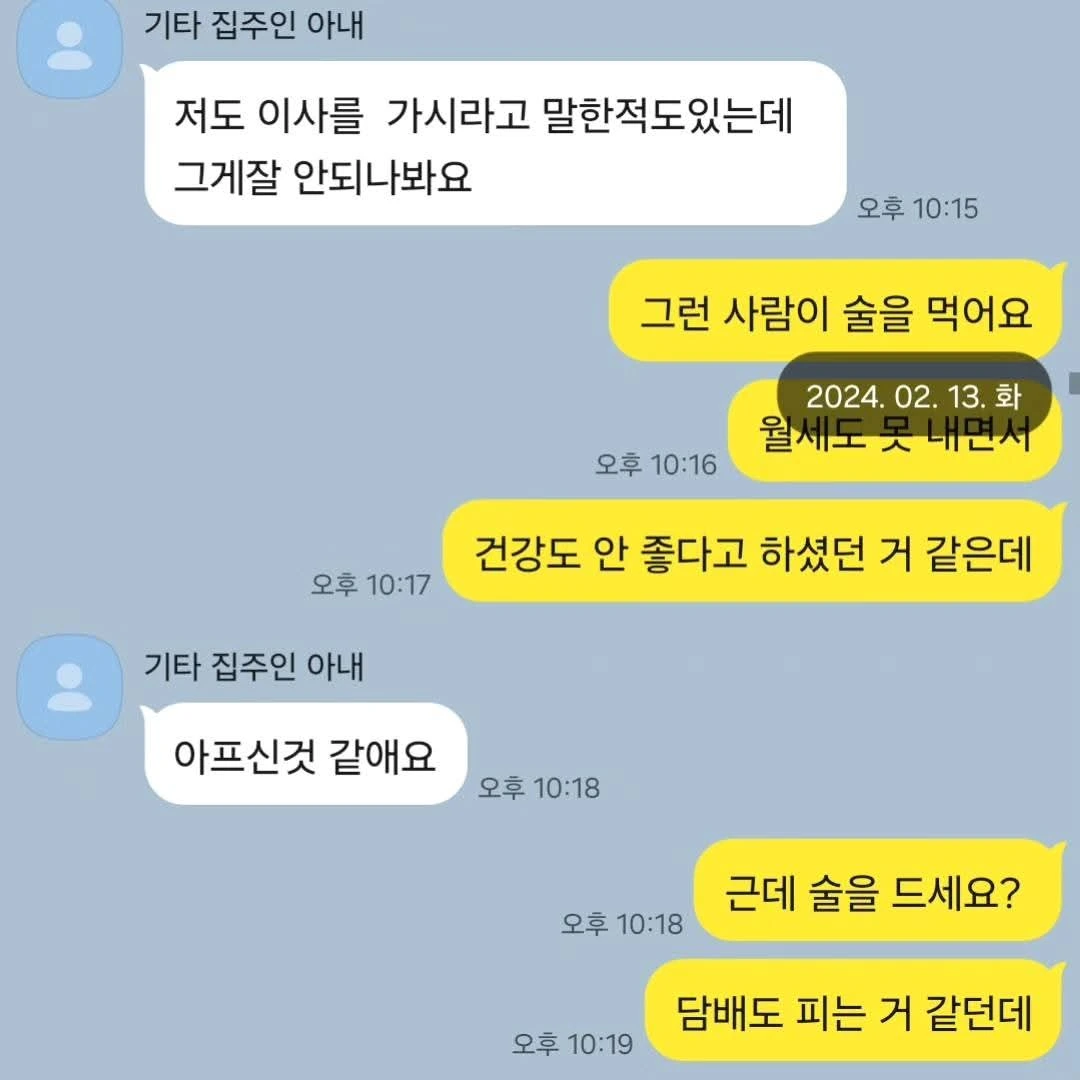 층간 소음이 너무 시끄러워 집주인에게 말할 때마다 집주인은 평소 월세가 됐든 뭐가 됐든 늦은 적 없고 외레 수돗세 등 관리 잘하는 제 주장을 인지했으며, 그 때마다 3층 바닥에 물이 고여 있어 시급하게 수리를 해야 하는데, 3층이 나가질 않아 수리도 못 하고 있다는 입장이었습니다.