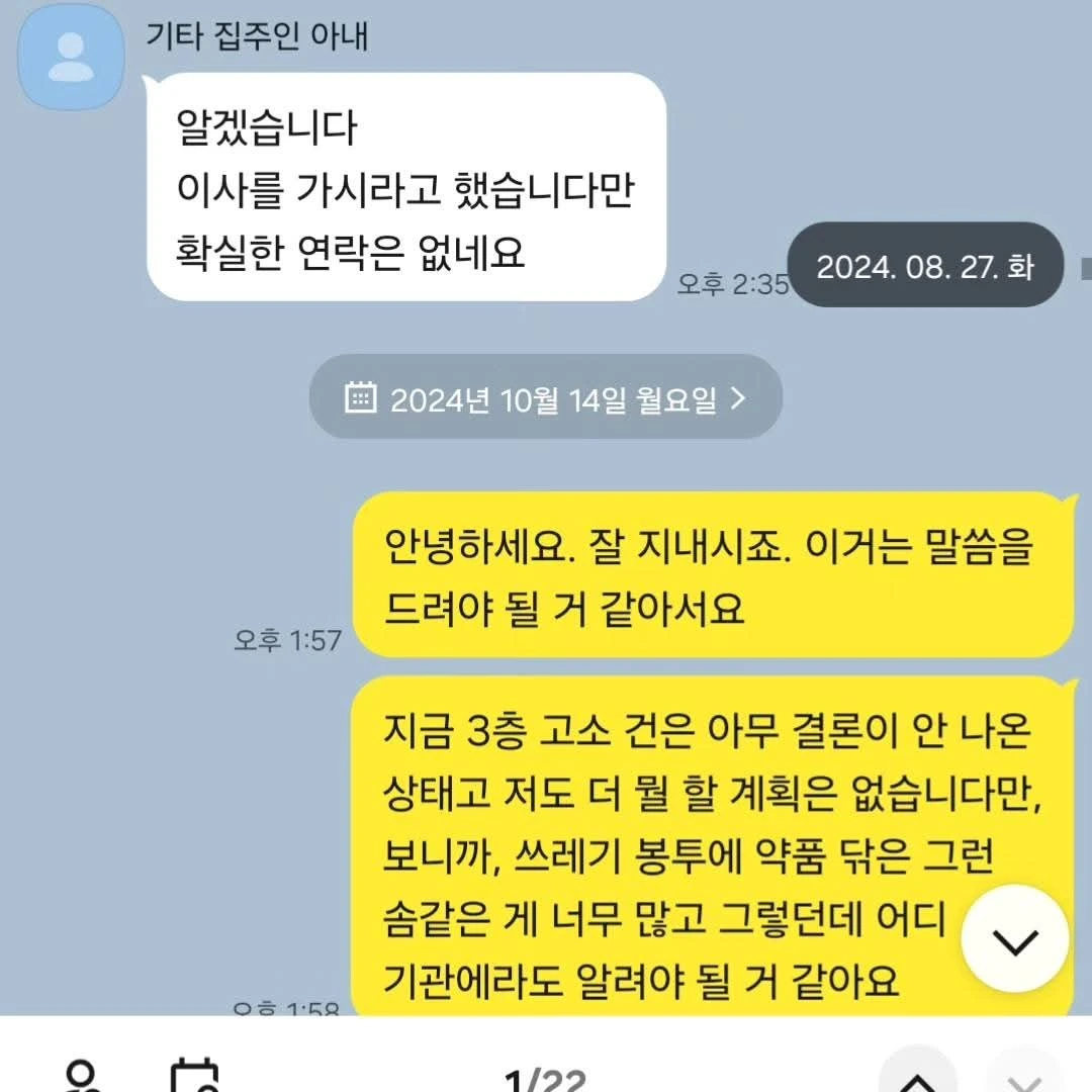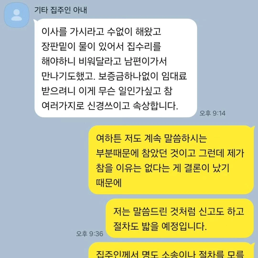 법적으로 문제가 있는 사람이 다른 문제로 이슈를 전환하는 건 흔한 현상이고, 자신의 본질적인 문제는 감추고 주변 사람에게 덮어씌우는 것도 통상적인 속임수라, 지금 이 집은 3층 수리가 시급함에도 3층이 악태를 부려 월세 한 번 밀린 적 없고 임대인과 구두 약정까지 한 제가 도리어 이사를 나가야 되는 불운한 상황임을 입증하죠.